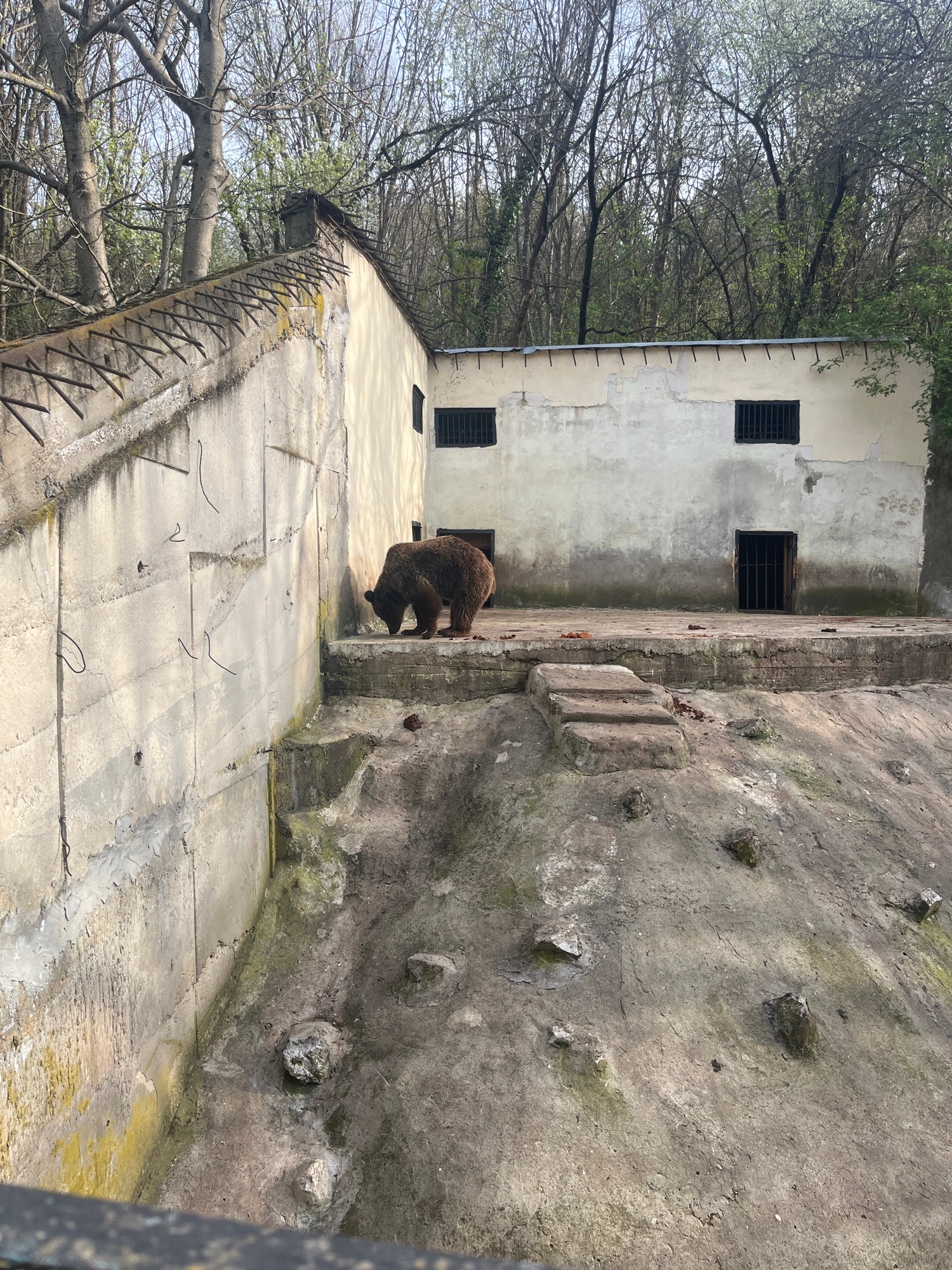 A brown bear is pictured inside what appears to be a concrete enclosure, likely at a zoo or wildlife park. The location appears to be Lovech, Bulgaria, as suggested by the architecture of the building…read more