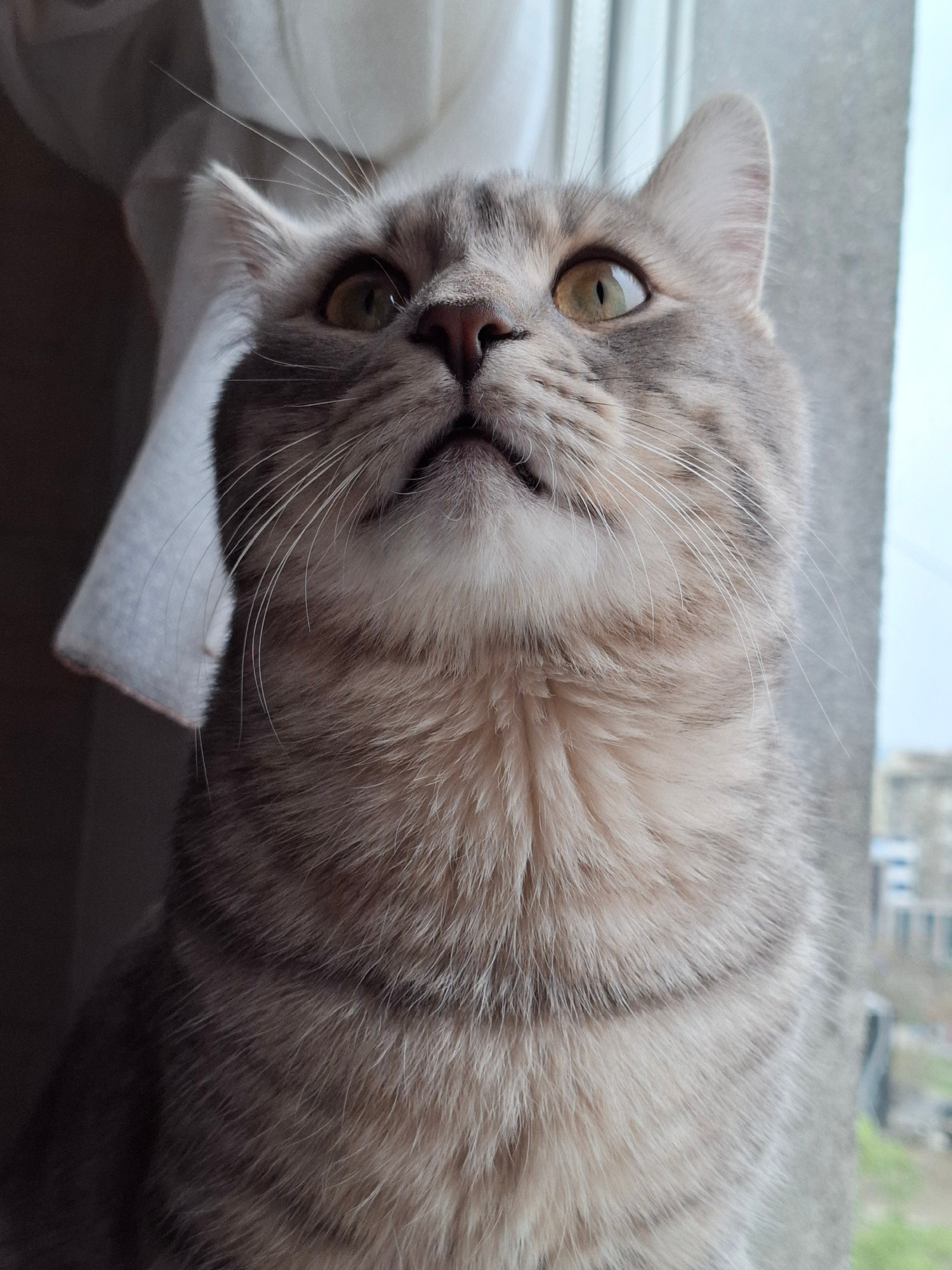 A close-up shot features a grey tabby cat lying on a white surface, possibly a window sill, with the cat facing the camera at a tilted angle. The cat has golden-green eyes and a pink nose. Its whisker…read more