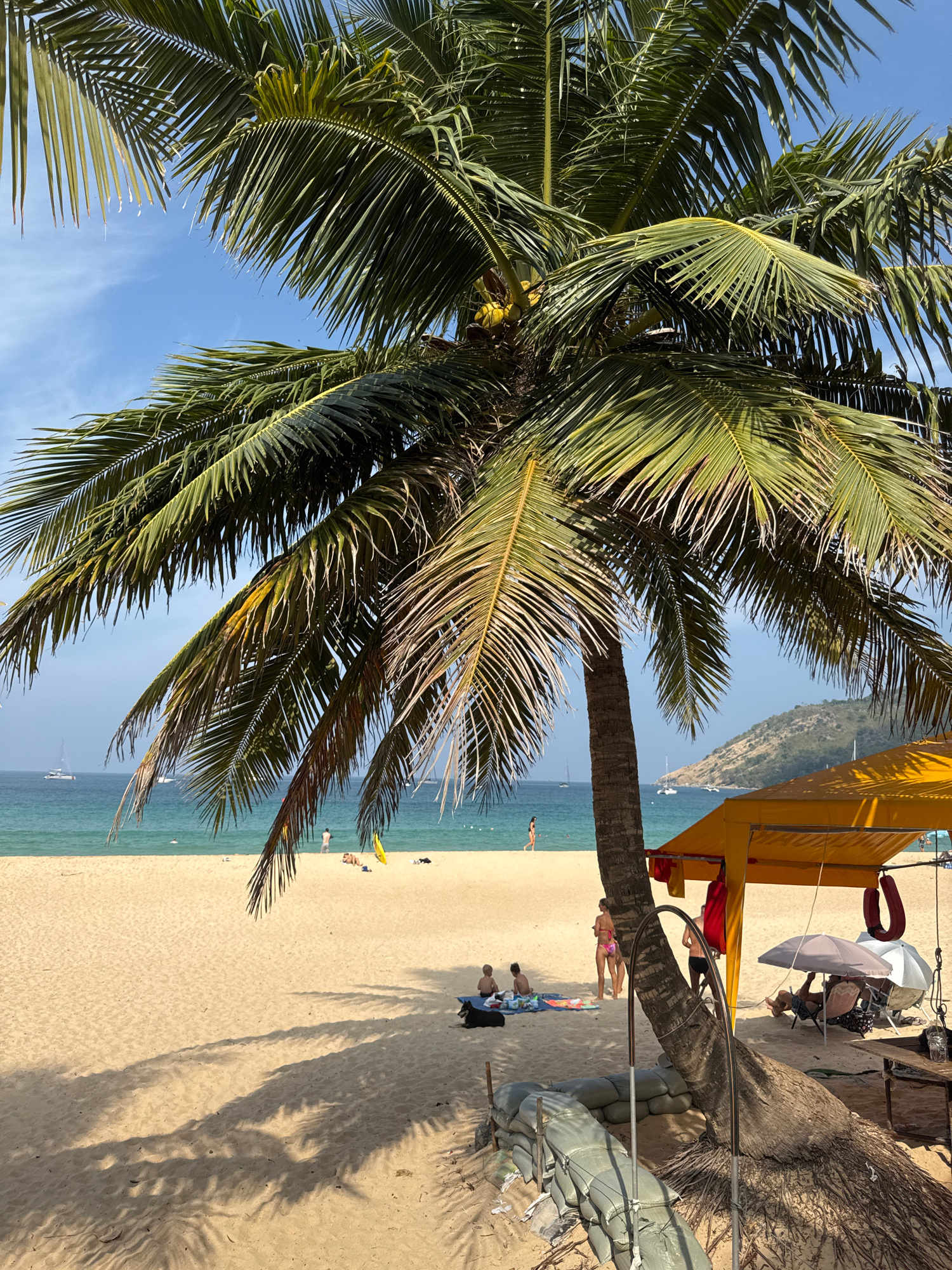 The image depicts a beach scene in Rawai, Thailand. The foreground features a palm tree with green fronds against a blue sky. In the background, there's a stretch of sandy beach where several people a…read more