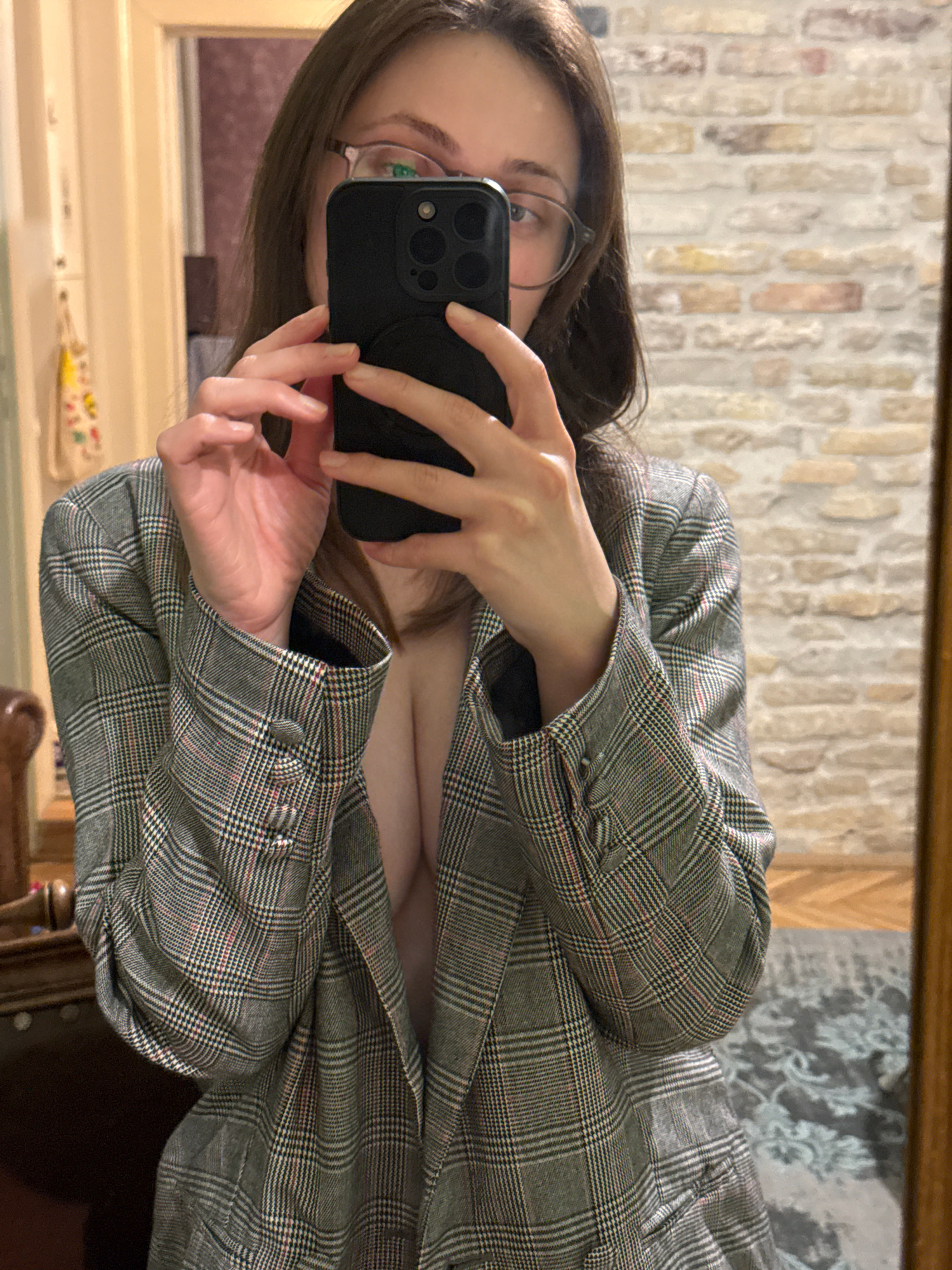 A woman is taking a selfie in a mirror. She is wearing glasses and a gray plaid blazer. Her bare chest is visible beneath the blazer. She is holding a black smartphone in her hands. The background inc…read more