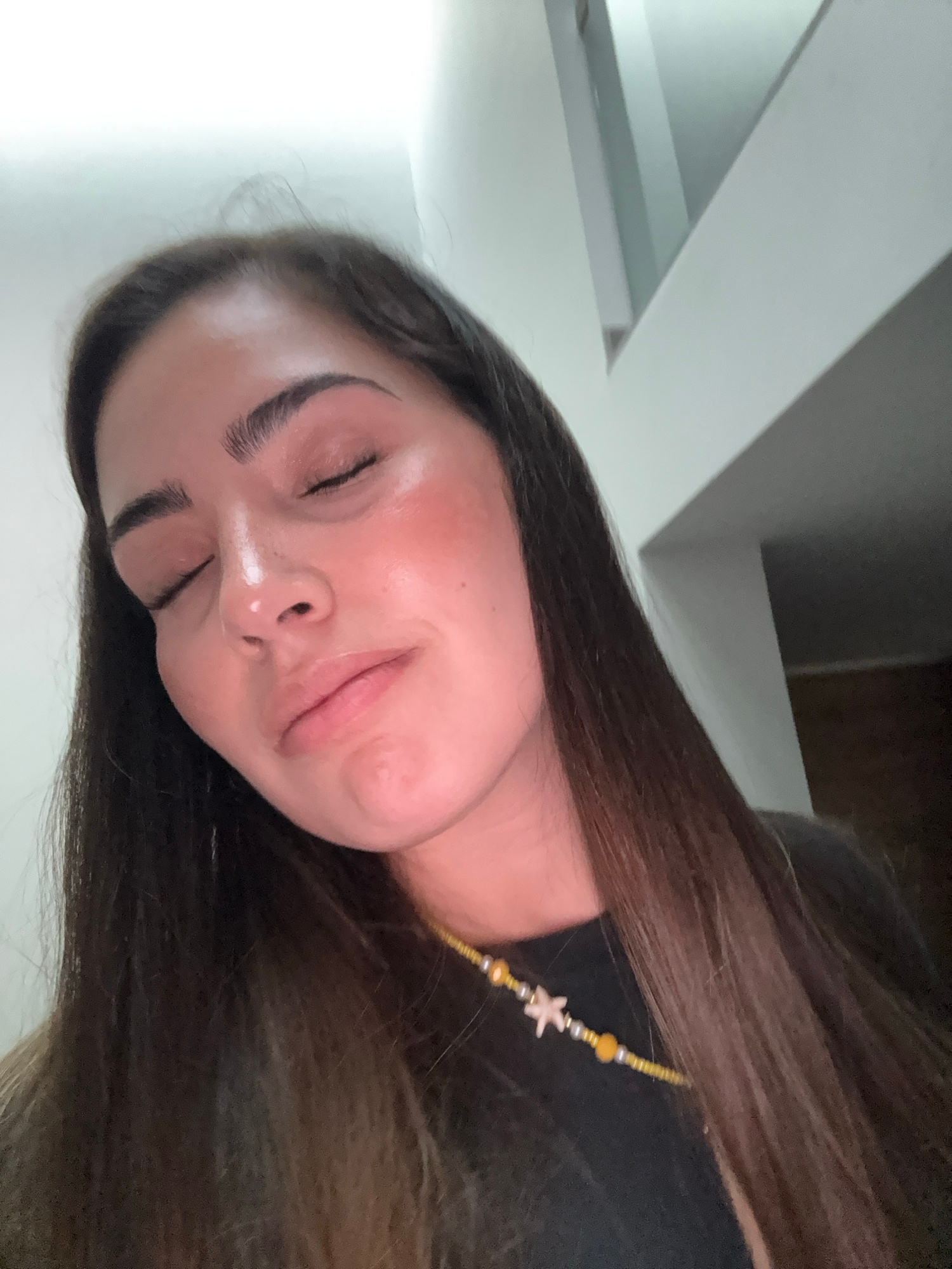 A close-up shot of a woman's face, tilted. She has dark hair, closed eyes, and appears to be lying down. She is wearing a beaded necklace with a starfish charm. The background shows a white ceiling. T…read more