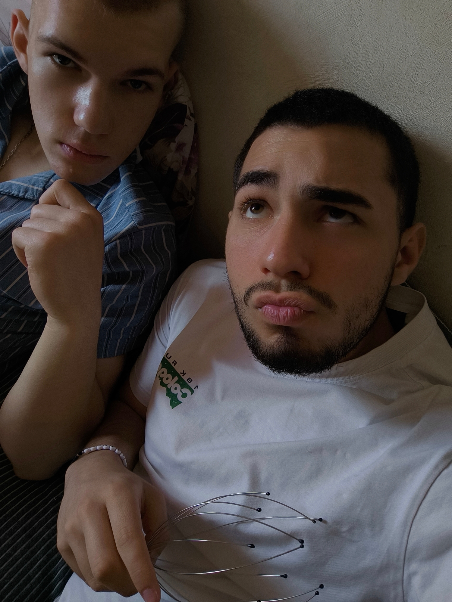 Two young men are pictured in a close-up, casual indoor setting, likely in Schiltigheim, France. The man on the left has short, light-colored hair and is wearing a blue and white striped shirt with a…read more