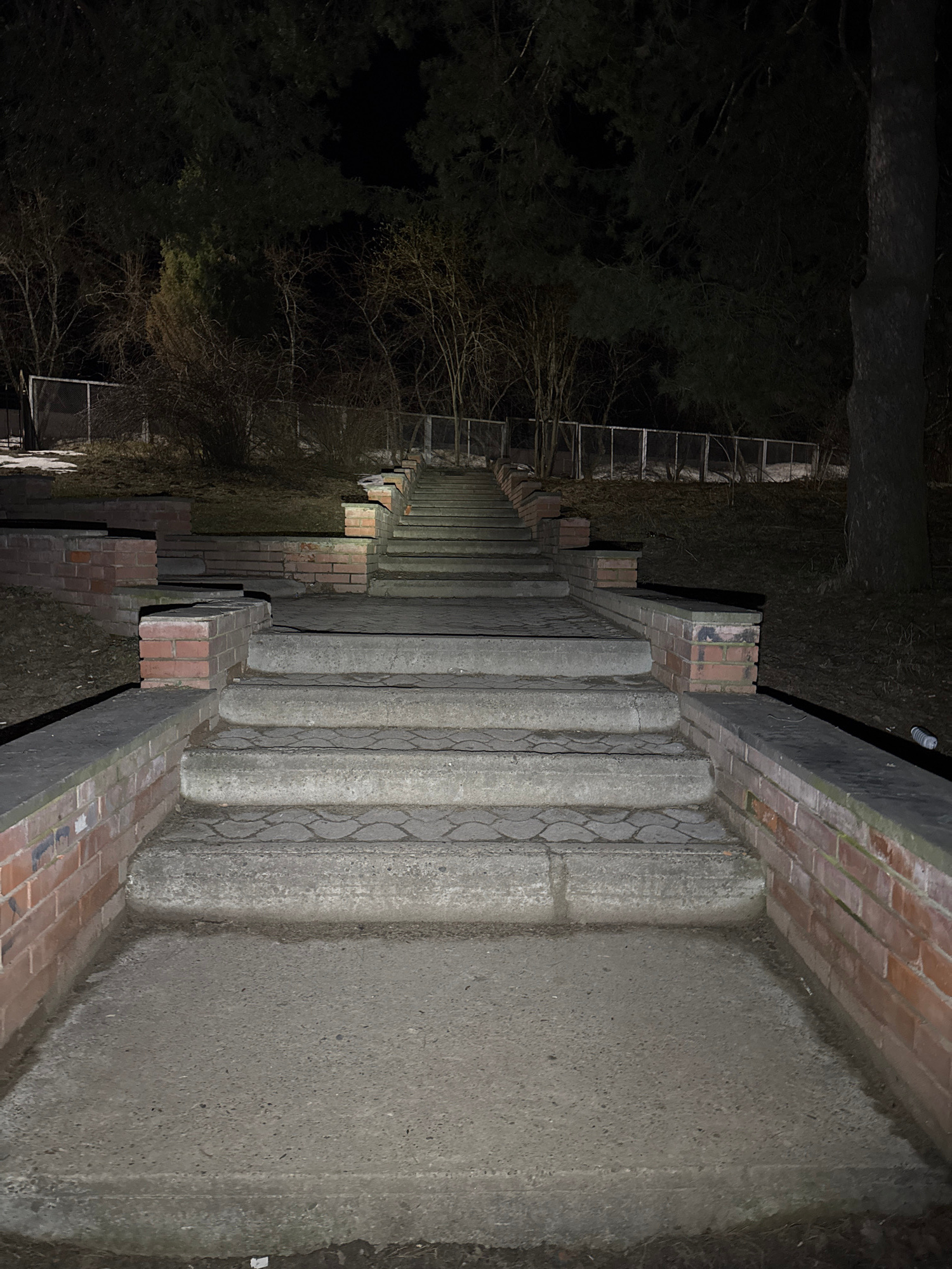 This is an image of a long, concrete staircase with brick trim. The staircase descends steeply away from the viewer, appearing to lead into darkness due to the night-time setting. A metal ladder is vi…read more
