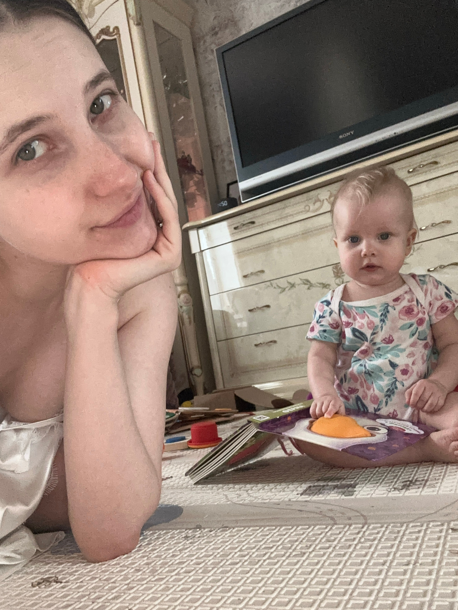 A woman lies on a patterned rug with her hands supporting her chin, taking a selfie. A baby in a floral outfit sits beside her, holding a board book with a cartoon bird on the cover. A TV is mounted o…read more
