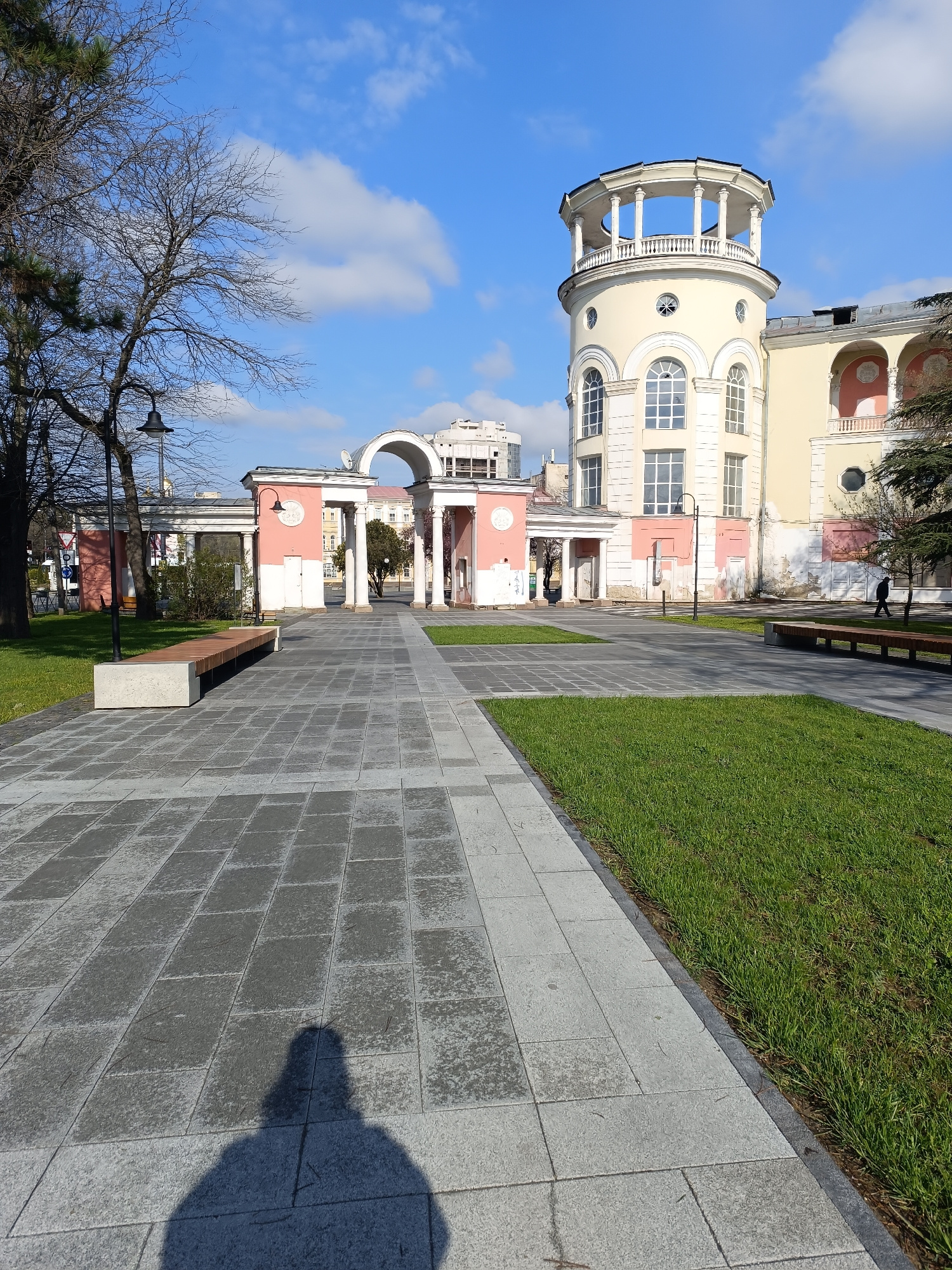 The image shows a square in Simferopol, Ukraine. The square is paved with grey stone and features patches of green grass. In the background is a two-story building with a cylindrical tower topped with…read more
