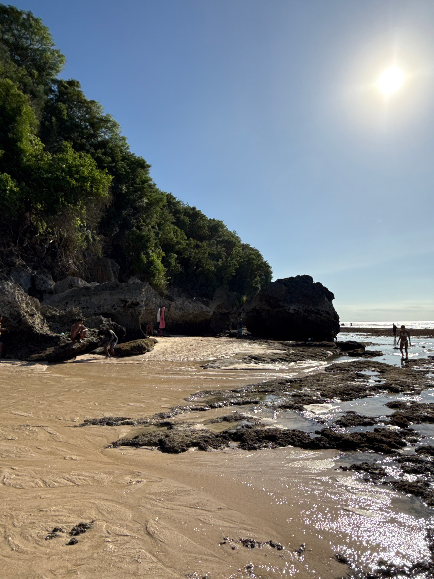 The image shows a coastline at Kuta Selatan, Indonesia. The scene is sunlit under a clear blue sky. In the foreground, a beach is visible with exposed rocks and tide pools. Several people are walking…read more
