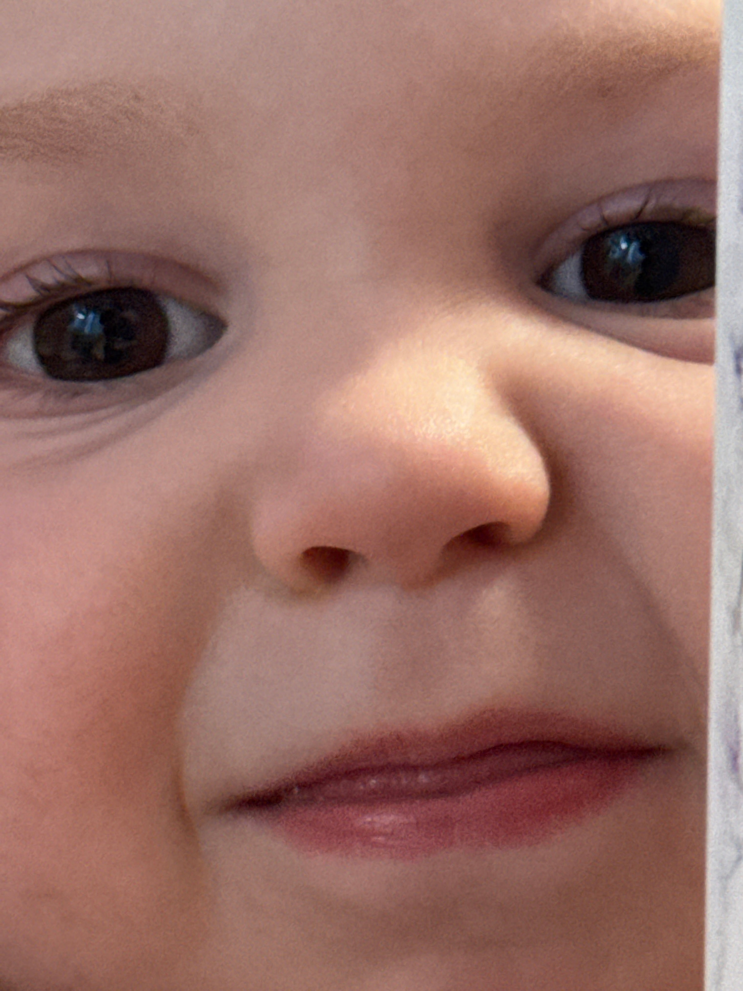 Close-up of a baby's face, featuring two eyes with dark irises, a small nose, and slightly open lips. The skin tone is light. The image is rotated counter-clockwise. There is no indication of the loca…read more