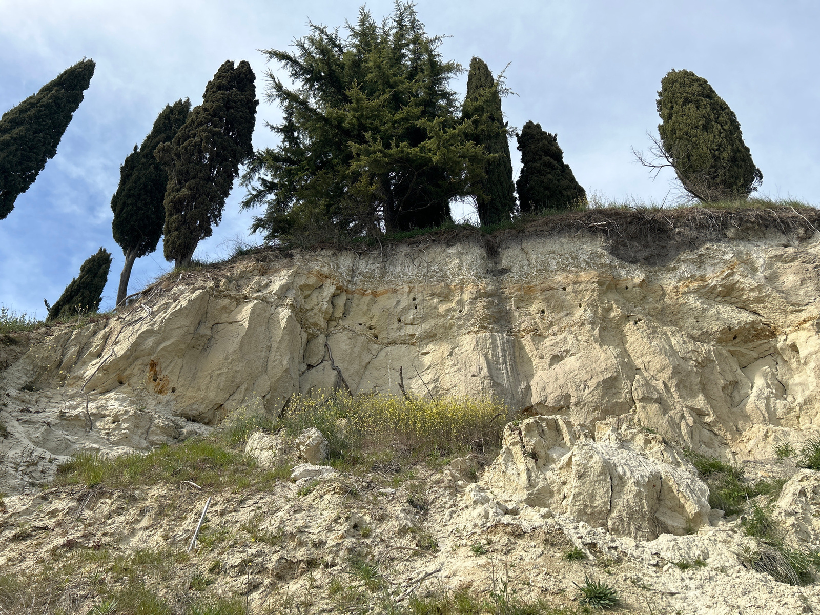 The image presents a dramatic natural landscape featuring a towering, light-colored cliff viewed from a low angle, looking upwards towards the sky. On the summit of the cliff, a line of tall, dark gr…read more