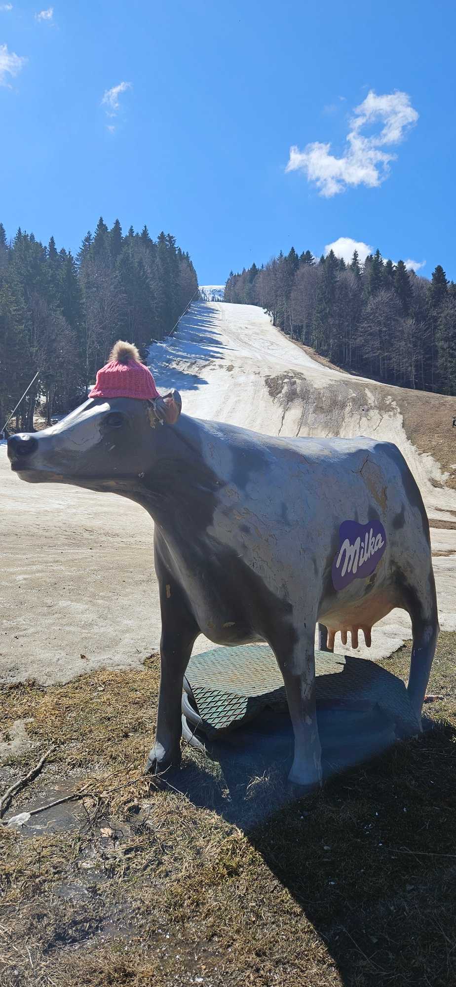 A long, low-angle outdoor shot depicts a life-sized statue of a gray cow with a "Milka" logo on its side. A pink knit hat with a pom-pom sits on the cow's head. The statue is positioned near a ski slo…read more