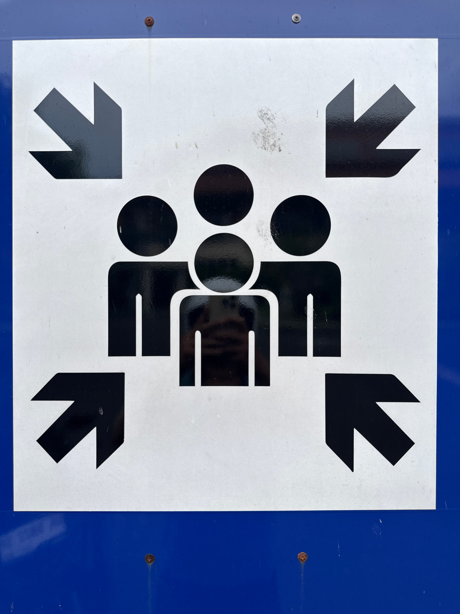 The image depicts a sign indicating a designated meeting point or assembly area. The sign consists of a white square with black graphics, mounted on a blue background. The graphic includes four arrows…read more
