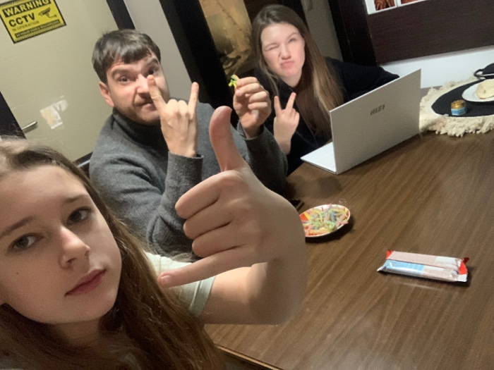 Three individuals pose for a selfie. A woman with long brown hair is in the forefront, another woman is on the left, and a man is situated in the center. Each person makes a hand gesture. They are pos…read more