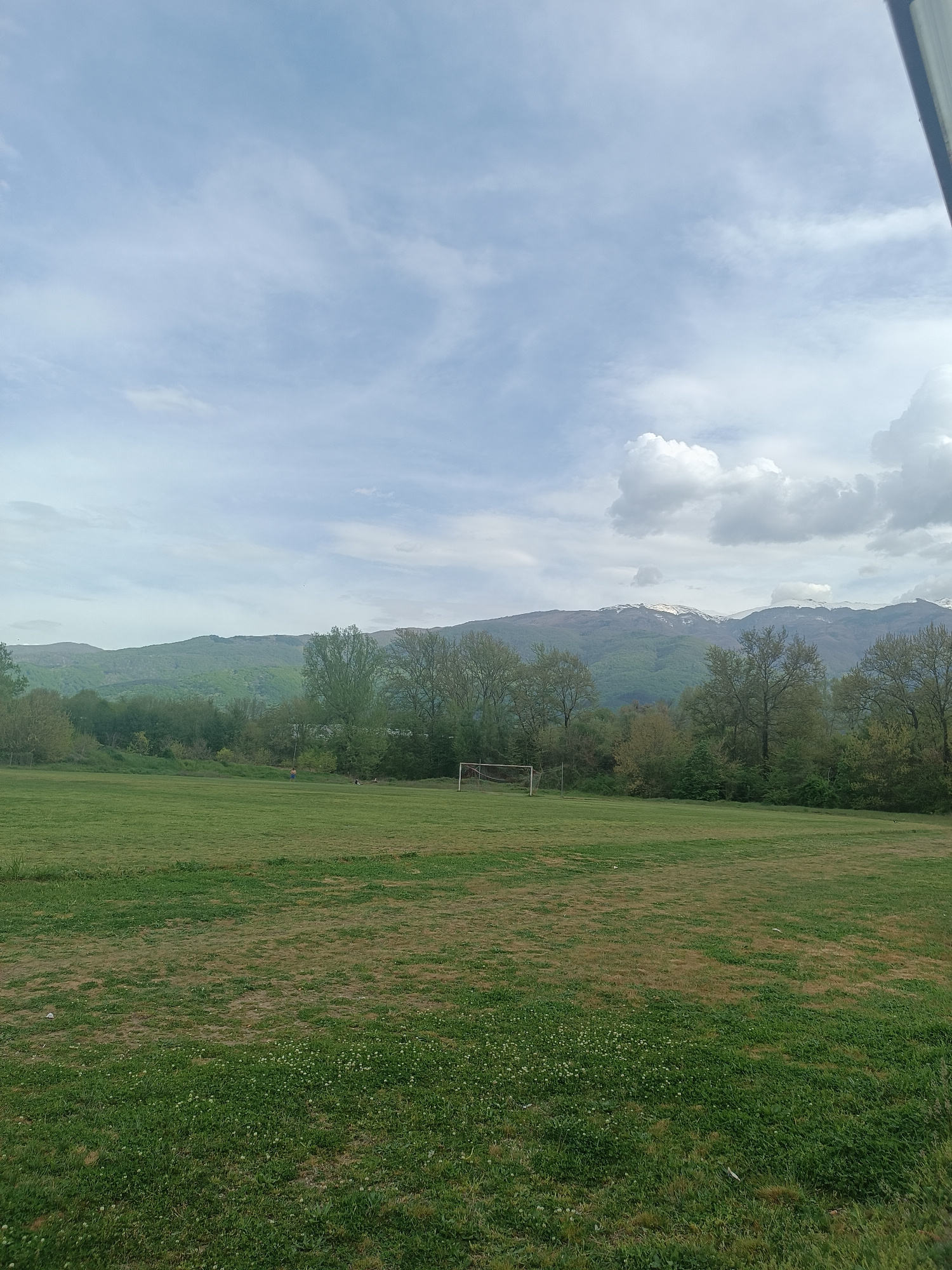This media file captures a panoramic view of a grassy football field, backed by lush green trees and distant mountains, under a cloudy sky. The setting appears to be rural or semi-rural, identified as…read more