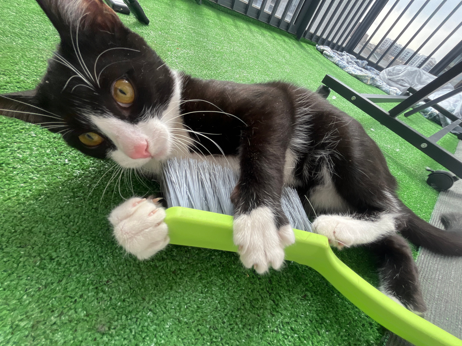A black and white kitten is lying on its side on a green artificial turf surface, holding onto a green-handled brush with gray bristles. The kitten's face is turned towards the camera with a playful e…read more