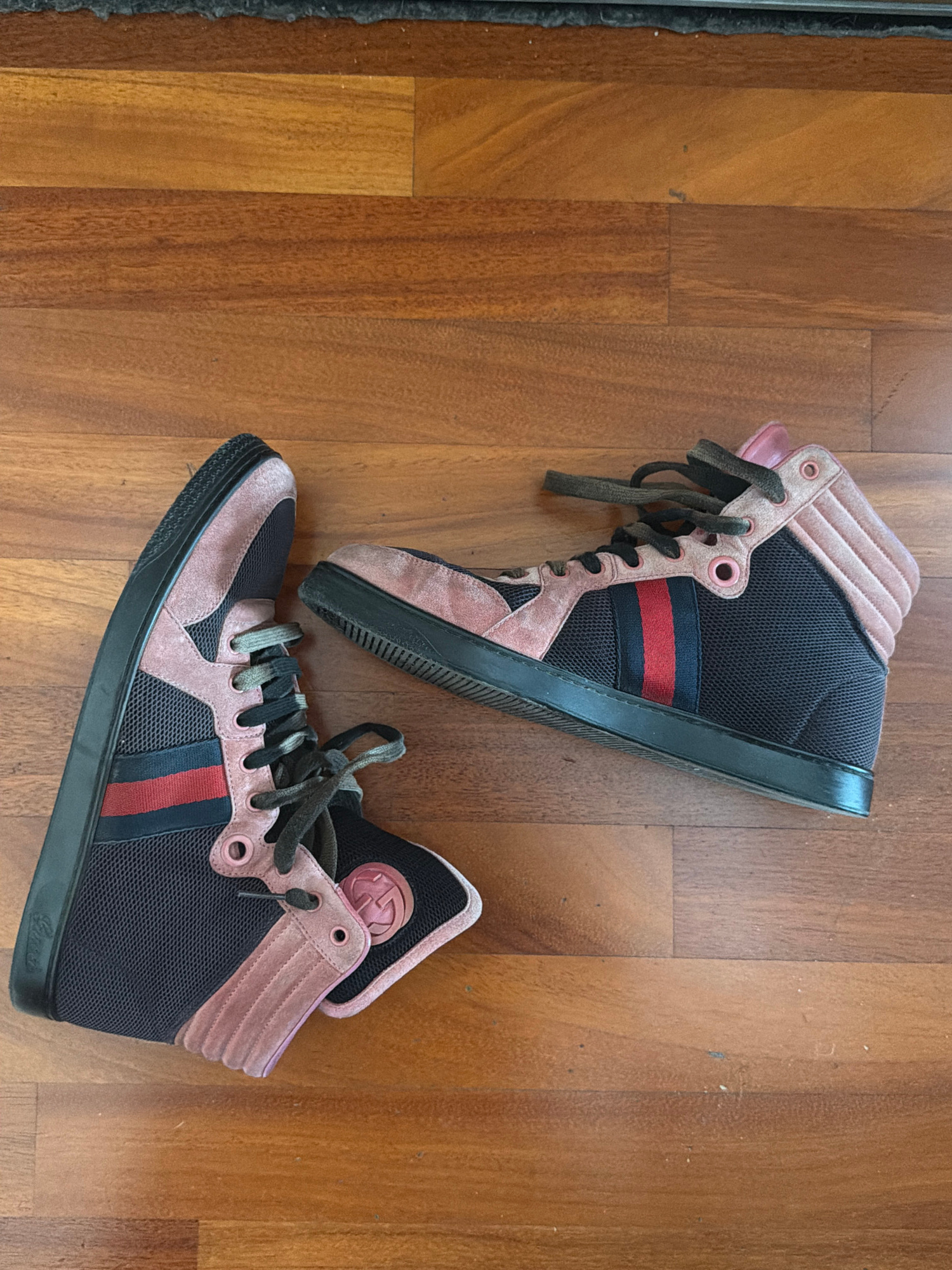 A pair of Gucci high-top sneakers are on a wooden floor. The sneakers are black with pink suede accents and have the signature Gucci stripe. The floor is made of wood planks. The setting doesn't reveaβ¦read more