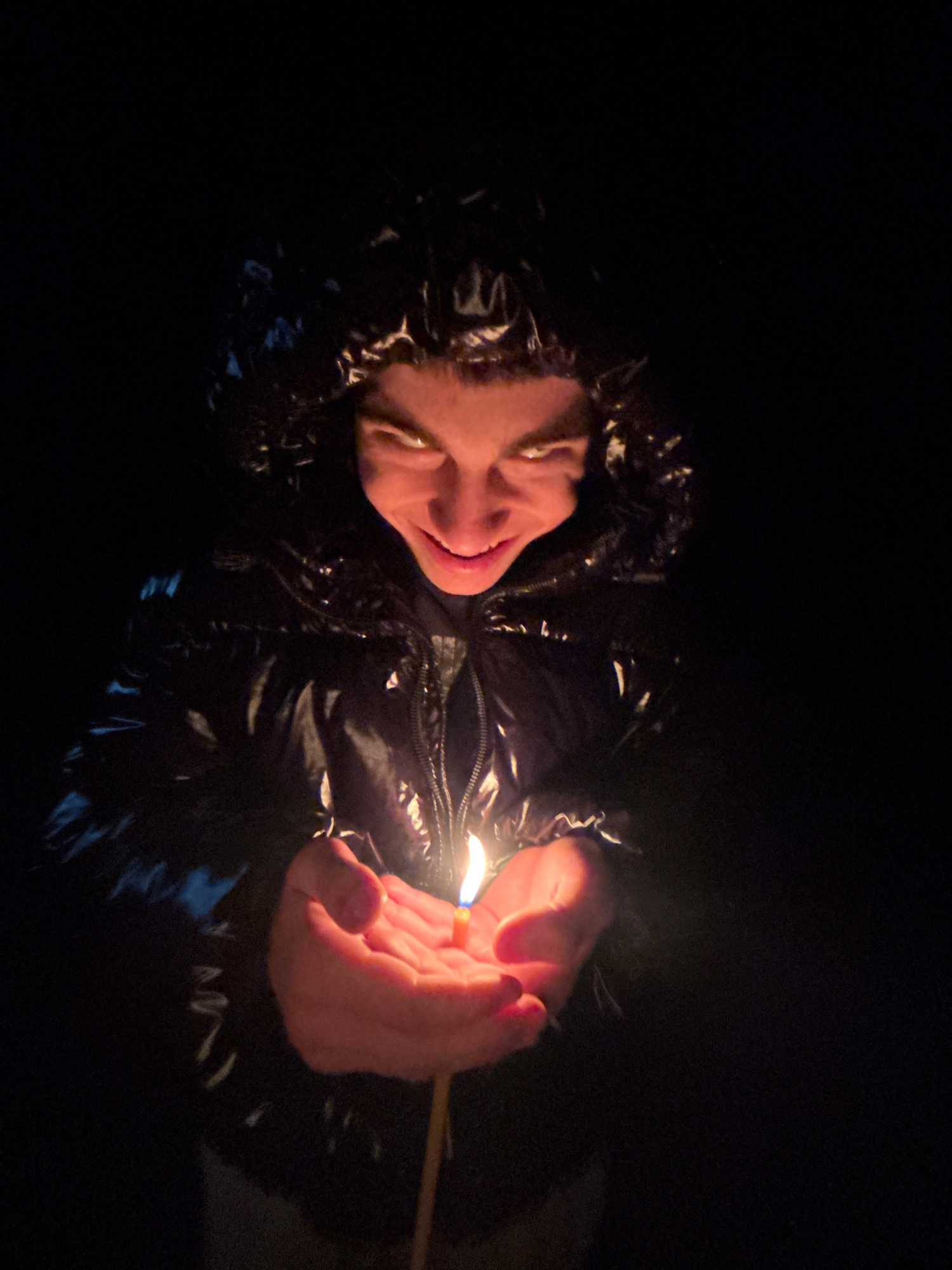 A close-up, high-angle shot shows a person holding a lit match in their cupped hands. The person is wearing a shiny black jacket with a hood. The light from the match illuminates the person's face, sh…read more
