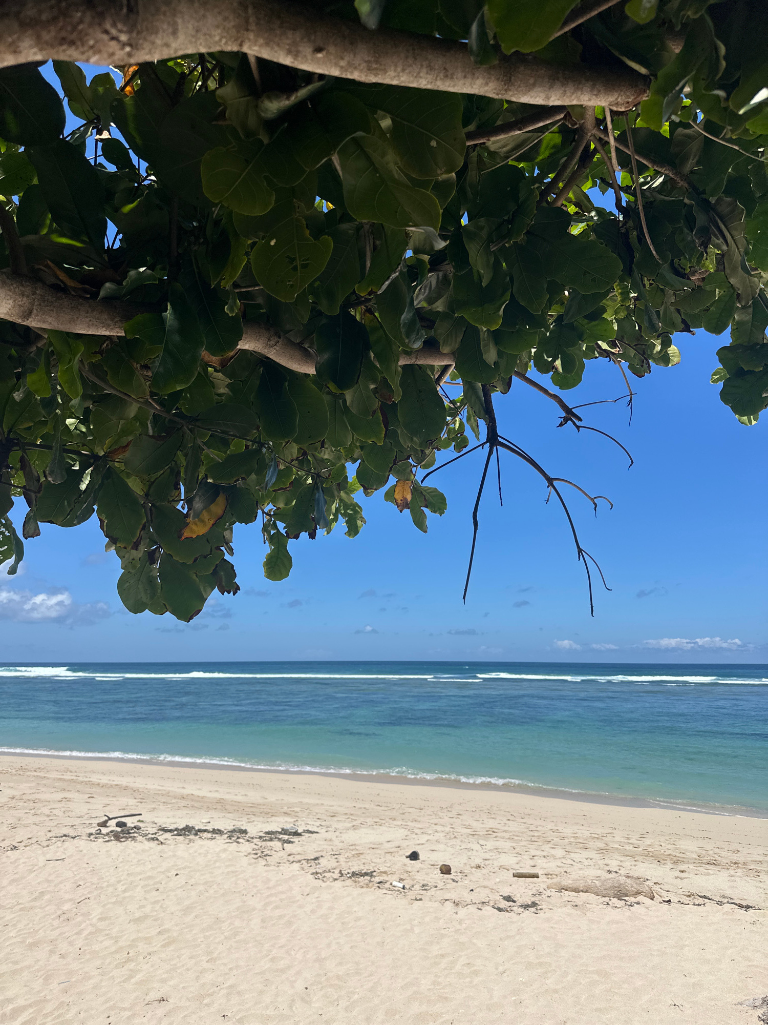 A serene beach scene in Kuta Selatan, Indonesia, is captured, viewed through the dense foliage of a tropical tree. On the left, prominent brown tree trunks and numerous large, dark green leaves fill t…read more