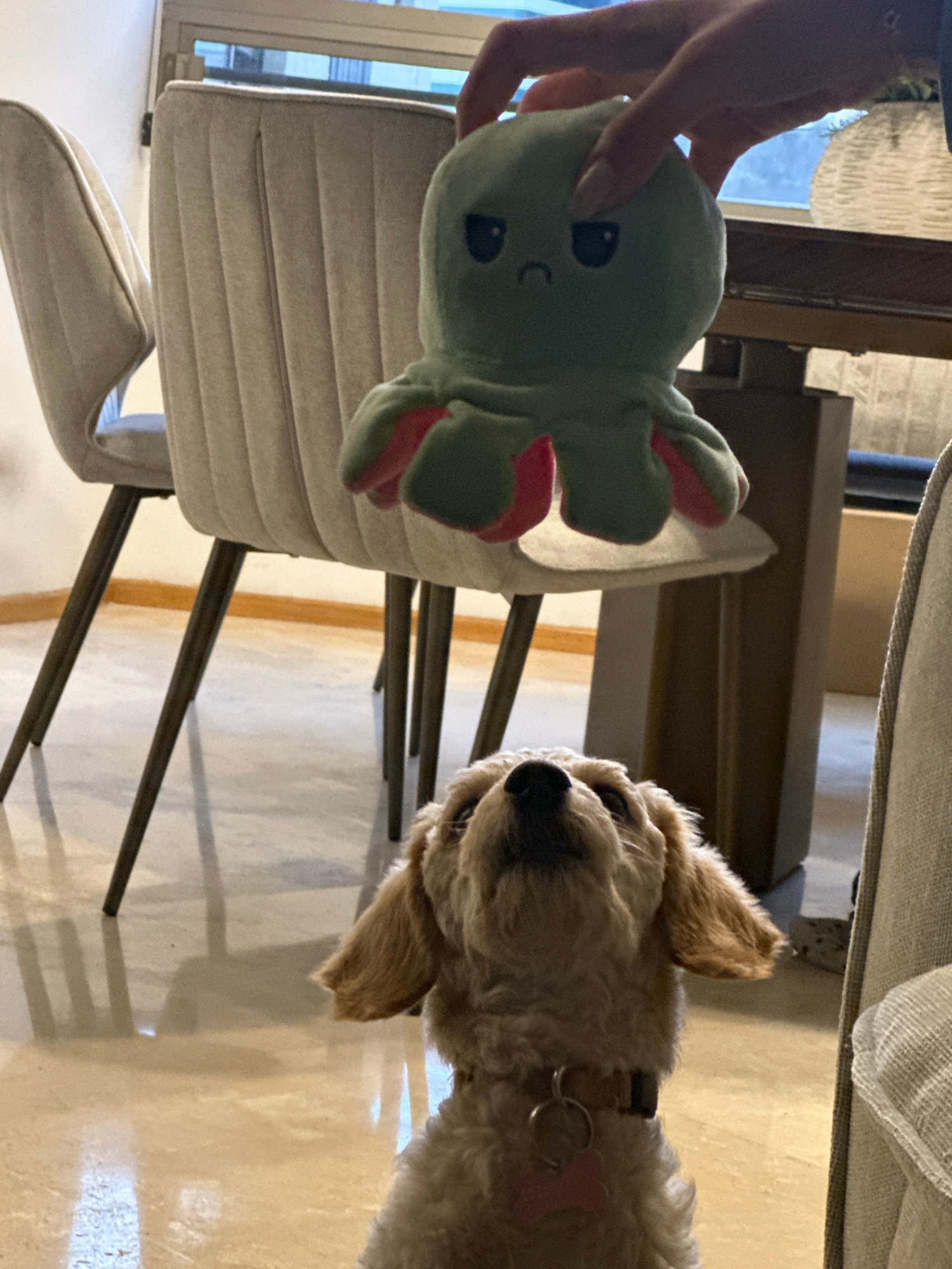 A tan poodle sits near a chair, while a hand holds a green stuffed octopus toy over the chair. The dog wears a collar with a heart-shaped tag. The location cannot be determined from the image.