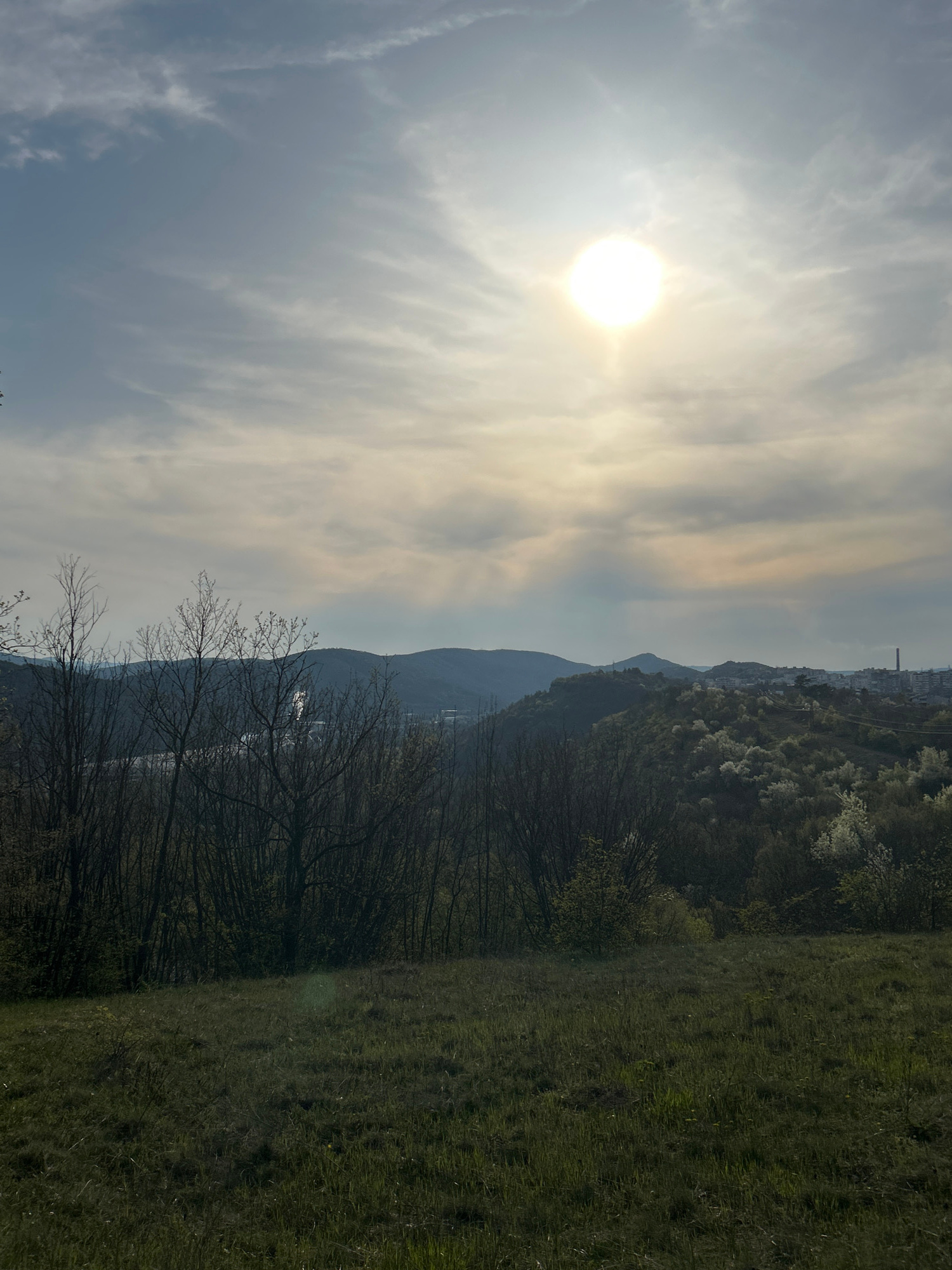 The image is a landscape view from Veliko Tarnovo, Bulgaria, taken outdoors during daylight hours. The sun is high in the sky, partially obscured by clouds, casting a bright glare. In the foreground,…read more