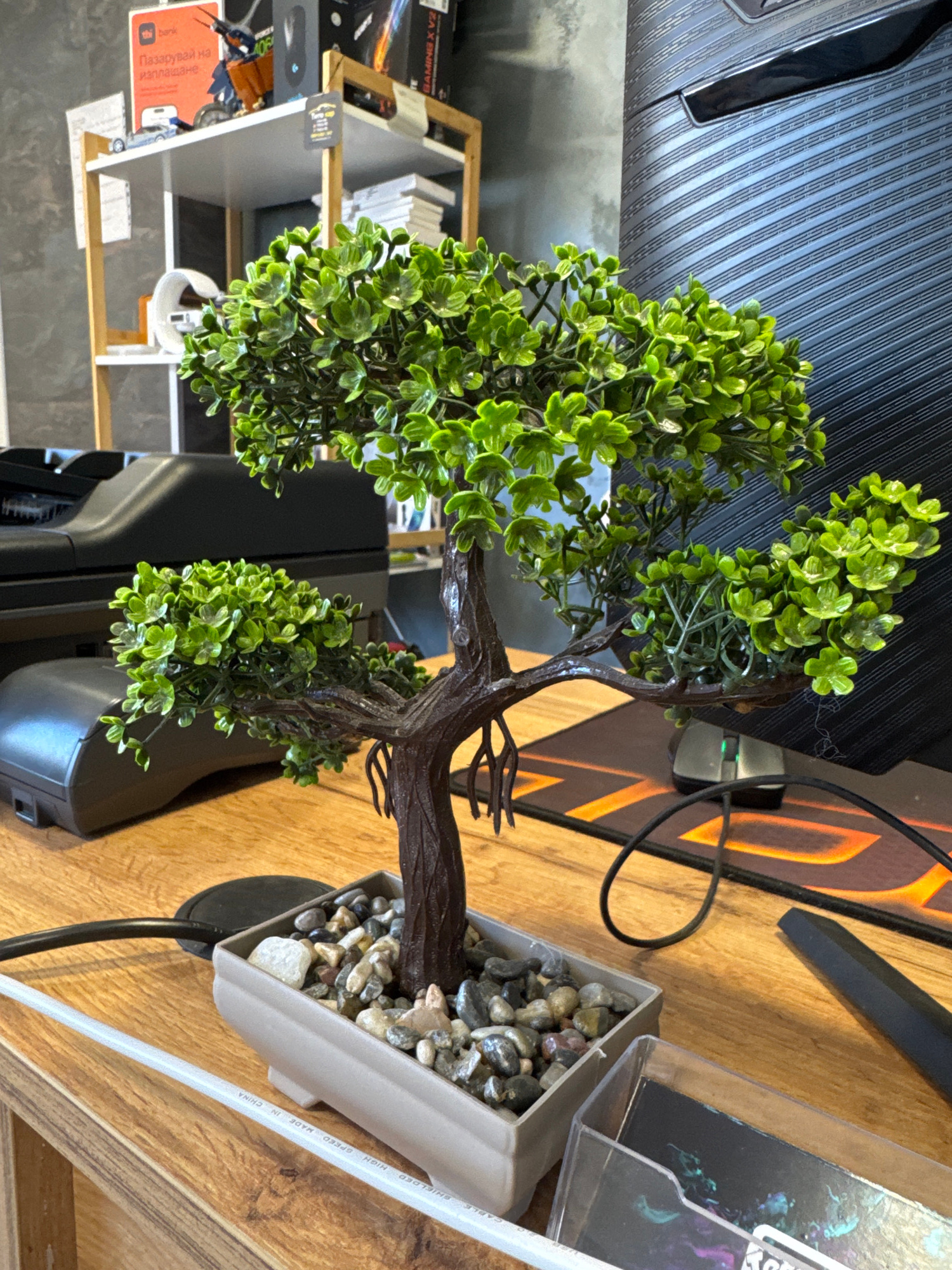 The image shows a desk setting. The focal point is a bonsai tree with vibrant green foliage, standing in a rectangular pot filled with small pebbles. The desk surface is wood-grained and serves as a b…read more