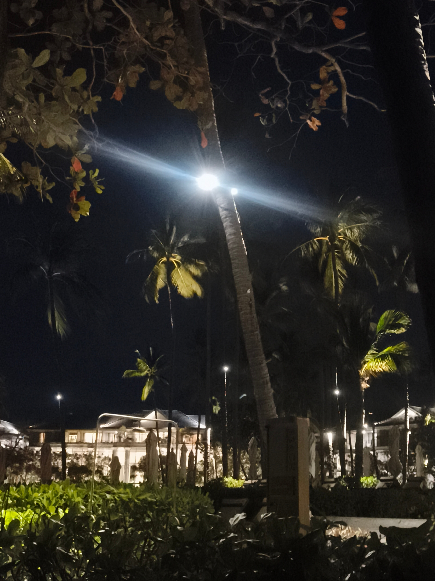 Captured at night, the image depicts a coastal scene likely in Baan Chaweng, Thailand. Palm trees illuminated by artificial lights dominate the frame, interspersed with other trees with sparse foliage…read more