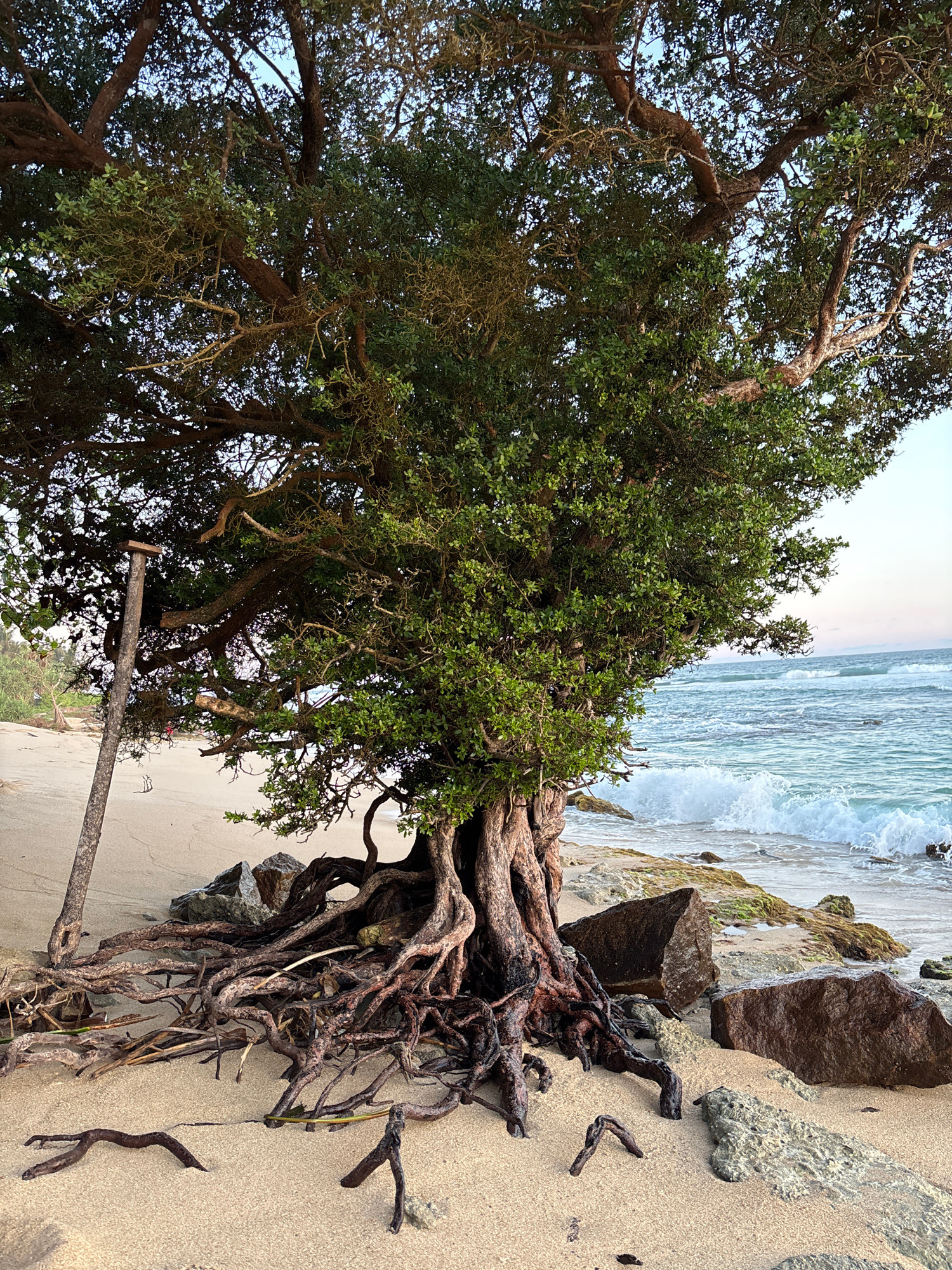 The image displays a serene coastal scene in Thalaramba, Sri Lanka, centered around a large, resilient tree growing directly at the edge of a sandy beach. The tree's most striking feature is its exten…read more
