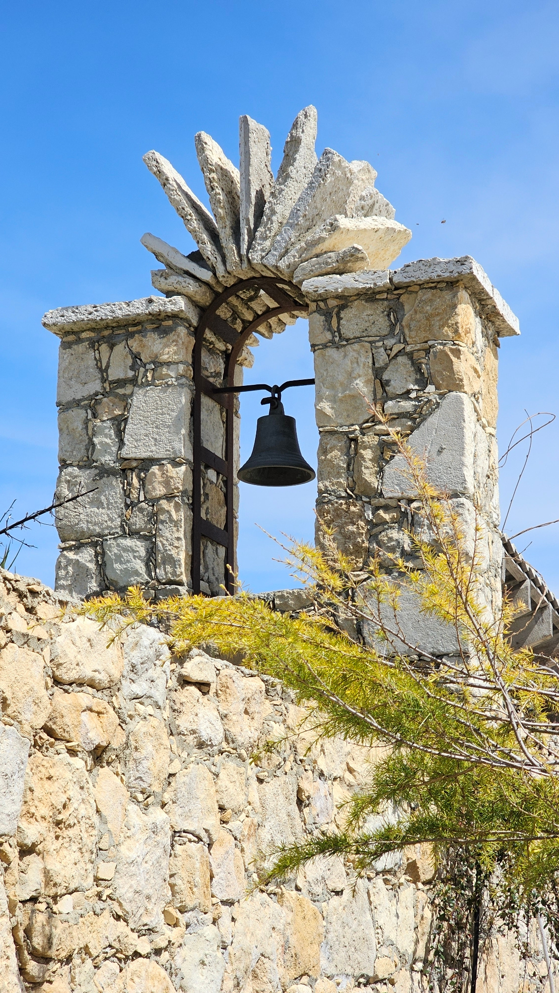 An upright shot captures a historical stone structure, possibly a bell tower, set against a bright, clear blue sky. The main feature is a dark metal bell, centrally suspended by a sturdy metal frame w…read more