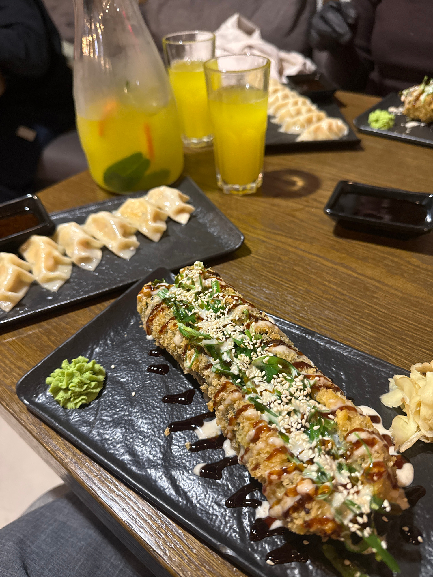 The image depicts a table setting with an array of food and drinks. There are two black rectangular plates, one displaying a row of dumplings and the other showcasing a large sushi roll decorated with…read more