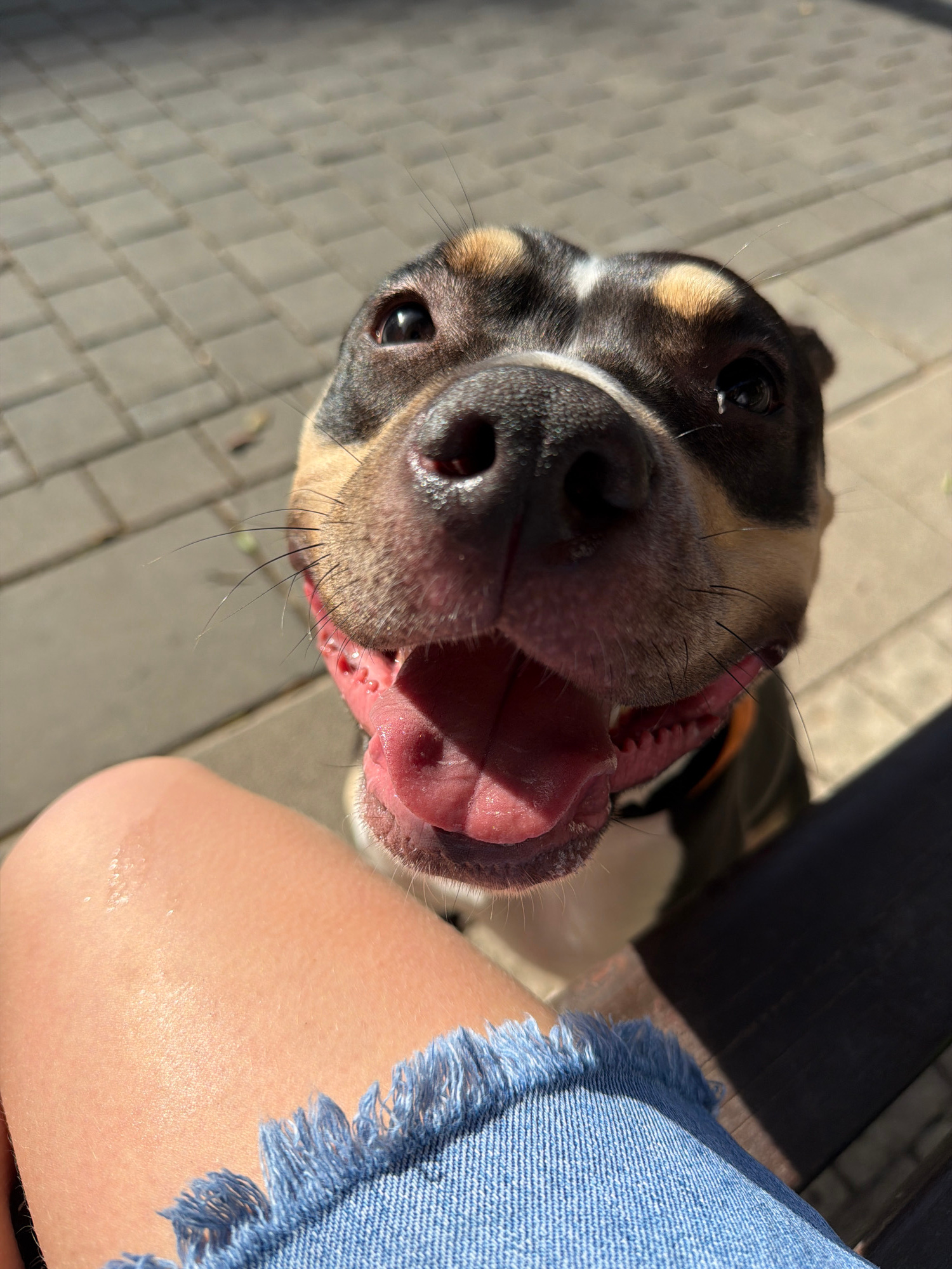 A close-up, top-down perspective captures a dog with its mouth open, exposing its tongue and teeth. The dog's fur is a mix of black, white, and tan. The dog appears to be near a person, as evidenced b…read more