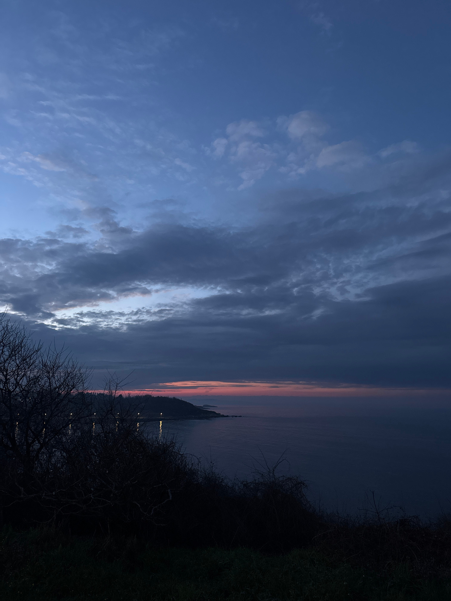 The image captures a dusk or dawn scene likely at sea, dominated by a dynamic sky. The left side features a gradient from light blue to darker hues with scattered, patchy clouds. The right side reveal…read more