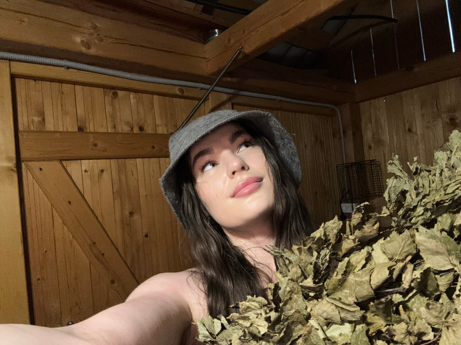 A person wearing a gray hat is in a wooden room with bundles of dried leaves. The person's face is visible, and they are looking at the camera. There is a wire basket hanging on the wall, and a corrug…read more