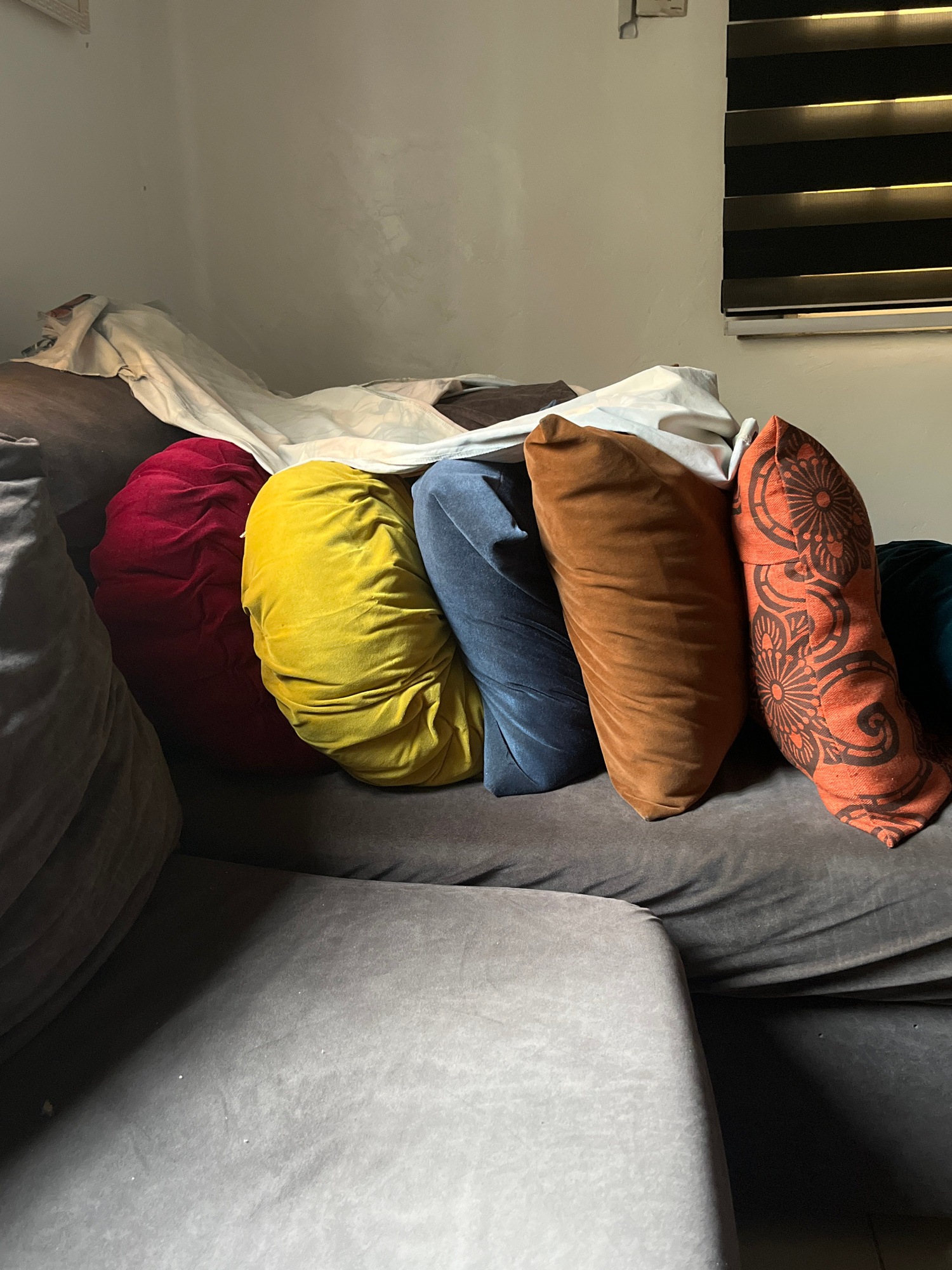 The image depicts a stack of six pillows of varying colors (orange, brown, blue, yellow, red, and white) placed on a grey couch. The location is possibly a home setting due to the presence of a window…read more
