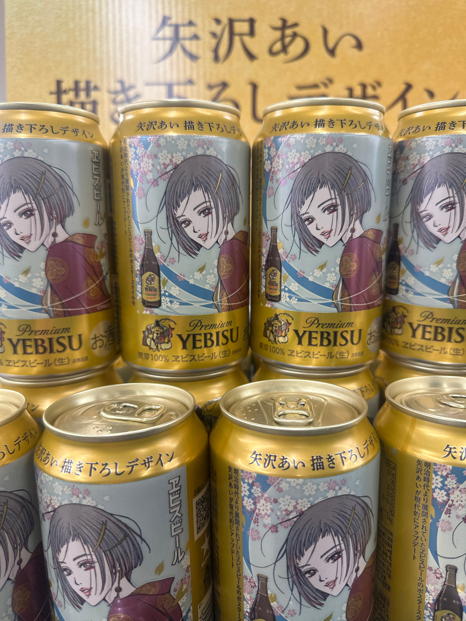 The image shows a stack of gold-colored beer cans with a collaborative design featuring artwork by manga artist Ai Yazawa. Each can features an anime-style female character dressed in a kimono against…read more