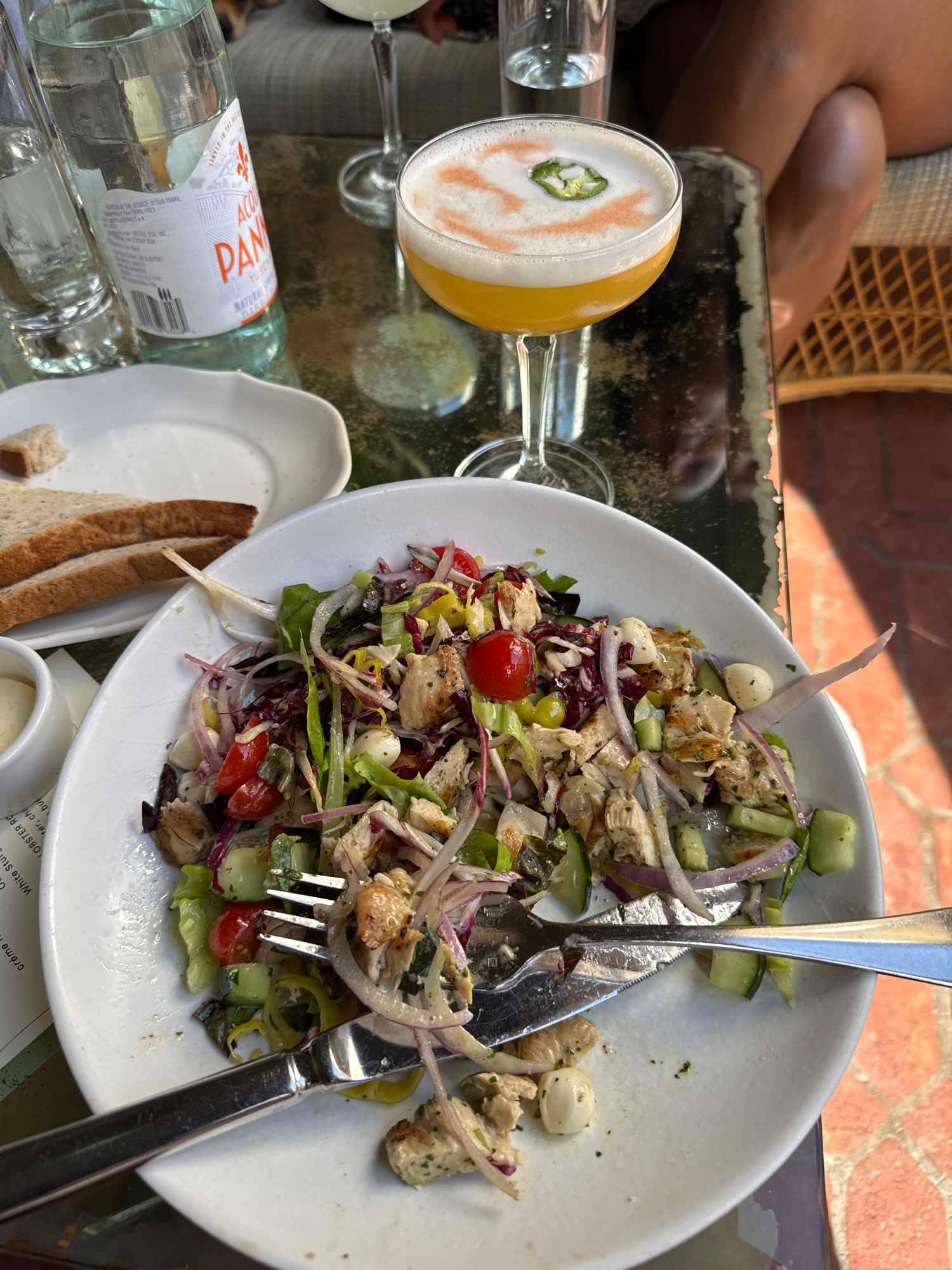 Here is a detailed description of the image: **Scene:** The image captures a meal scene, likely at an outdoor dining area. **Location:** While not explicitly stated, the OCR text on the water bottl…read more
