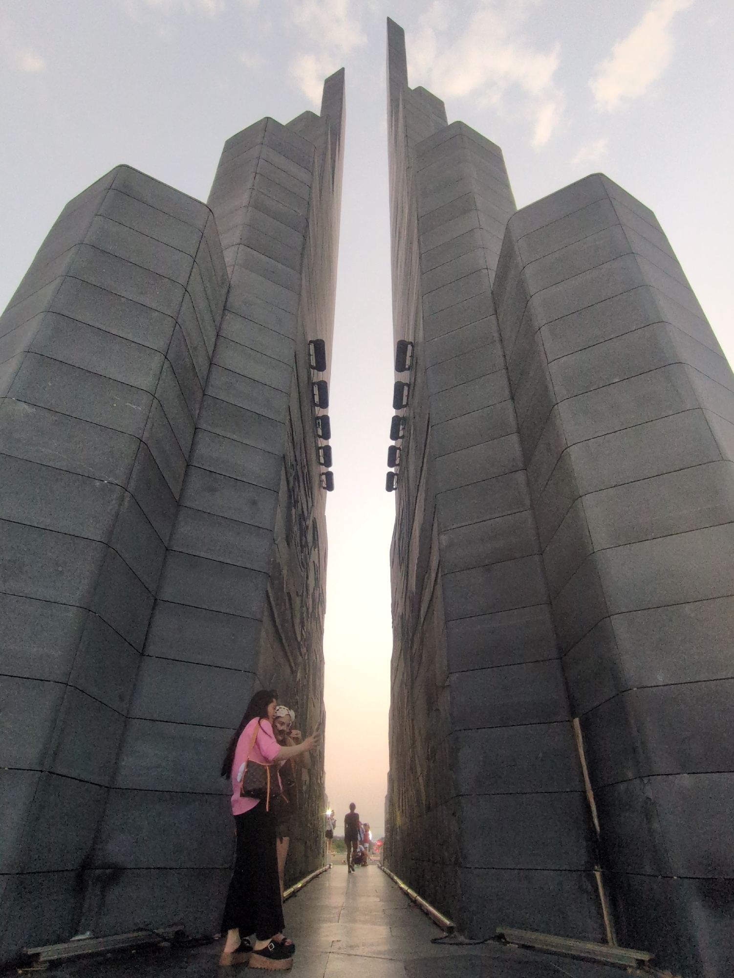 A person is visible in the image. She is situated between two large, gray, textured structures and is gesturing upwards. She is wearing a pink shirt and dark skirt. Other people are visible farther aw…read more