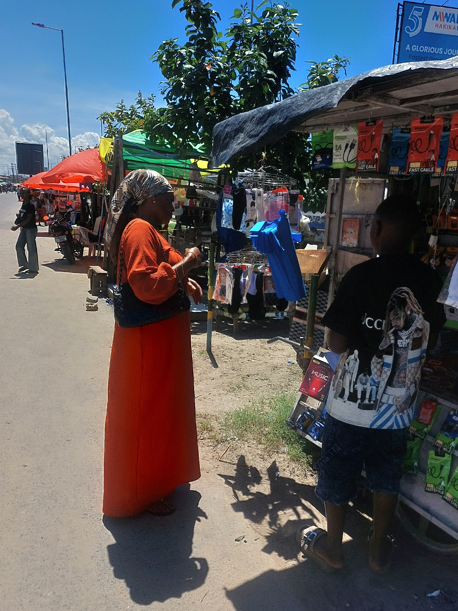 This image depicts a street scene in what appears to be Dar es-Salaam, Tanzania. An elderly woman wearing a patterned headscarf and an orange dress stands near a makeshift roadside stall. A young boy…read more