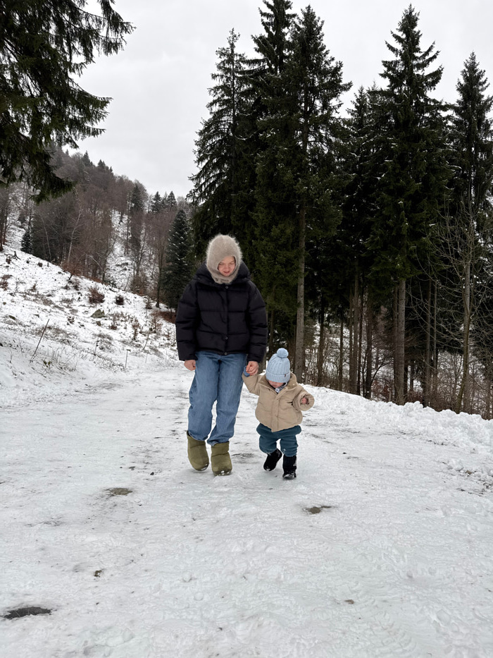 A woman wearing a black puffy jacket, blue jeans, and green boots stands on a snowy slope next to a small child. The child, bundled in a beige jacket, blue hat, and black boots, appears to be holding…read more