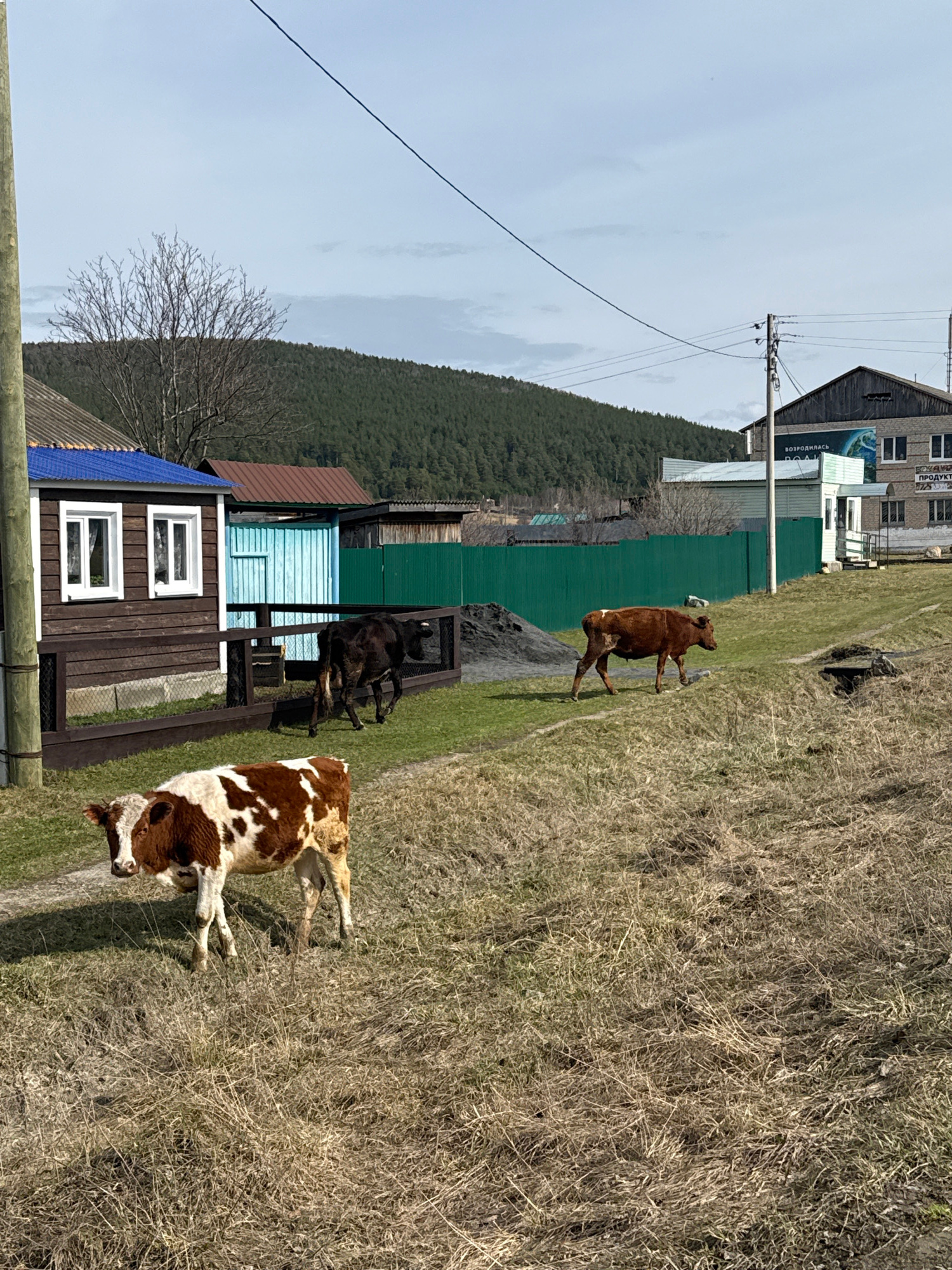 The image depicts a rural scene in Tyulyuk, Russia. Three cows are grazing in a grassy area. In the background are several wooden structures, including a two-story building with a blue roof and white-…read more