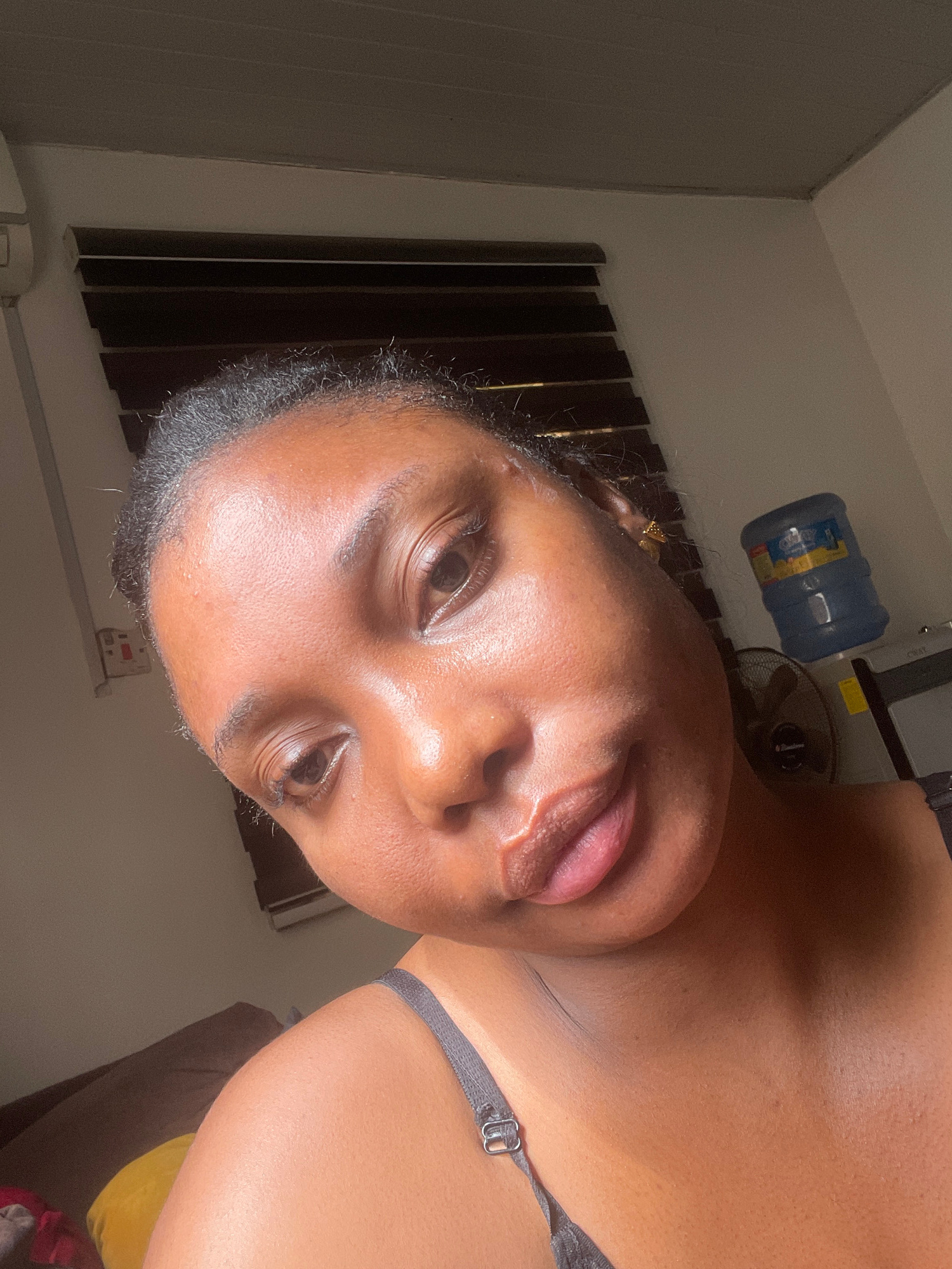 A close-up, dimly lit selfie taken indoors. A dark-skinned woman is the main subject. She faces the camera with a slight tilt of her head. Details of her facial features, including eyes, nose, and lip…read more