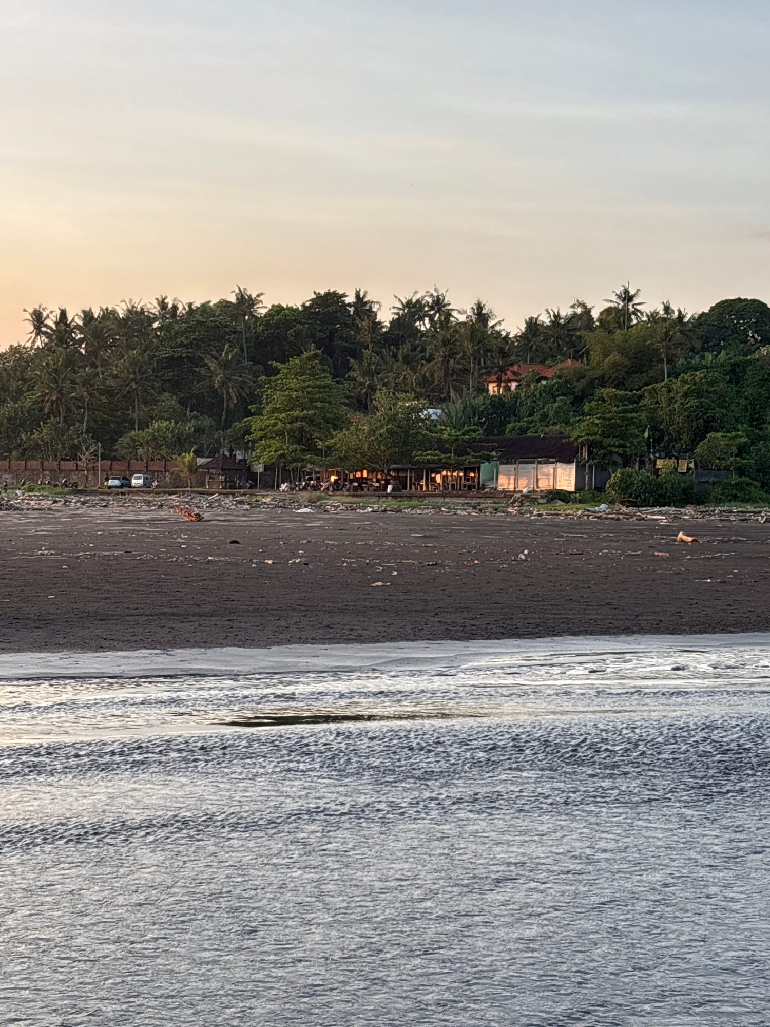 The image depicts a coastline, likely a beach, in Kerambitan, Indonesia. Lush green vegetation, including palm trees, lines the edge of the beach, with structures, possibly restaurants or resorts, vis…read more