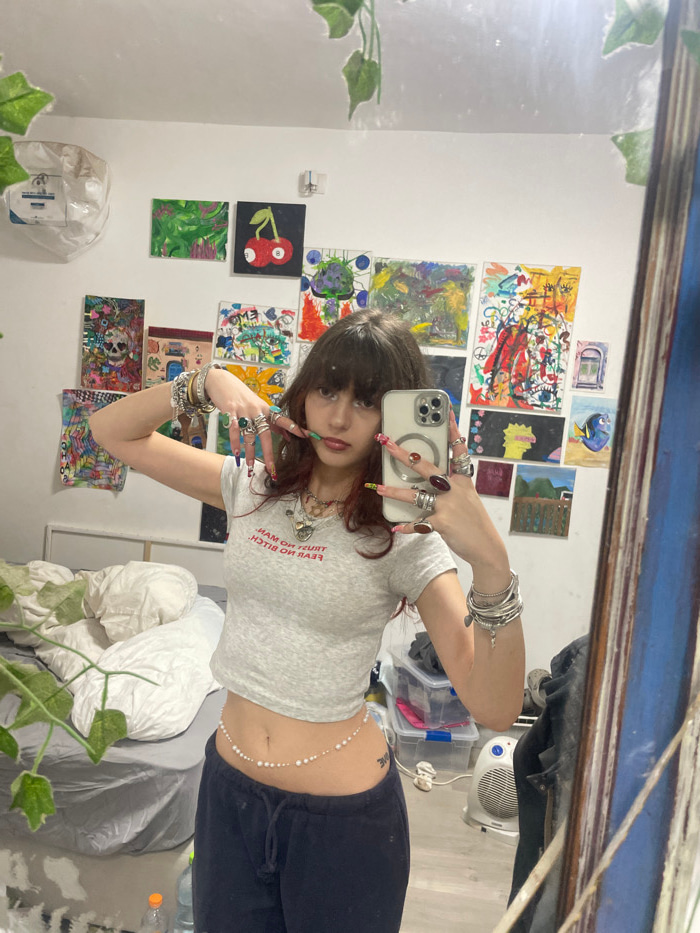 A young person with dark hair and bangs is captured in a mirror selfie within a bedroom in Raanana, Israel. The individual wears a light grey fitted crop top with red text reading "TRUST NO MAN, FEAR…read more