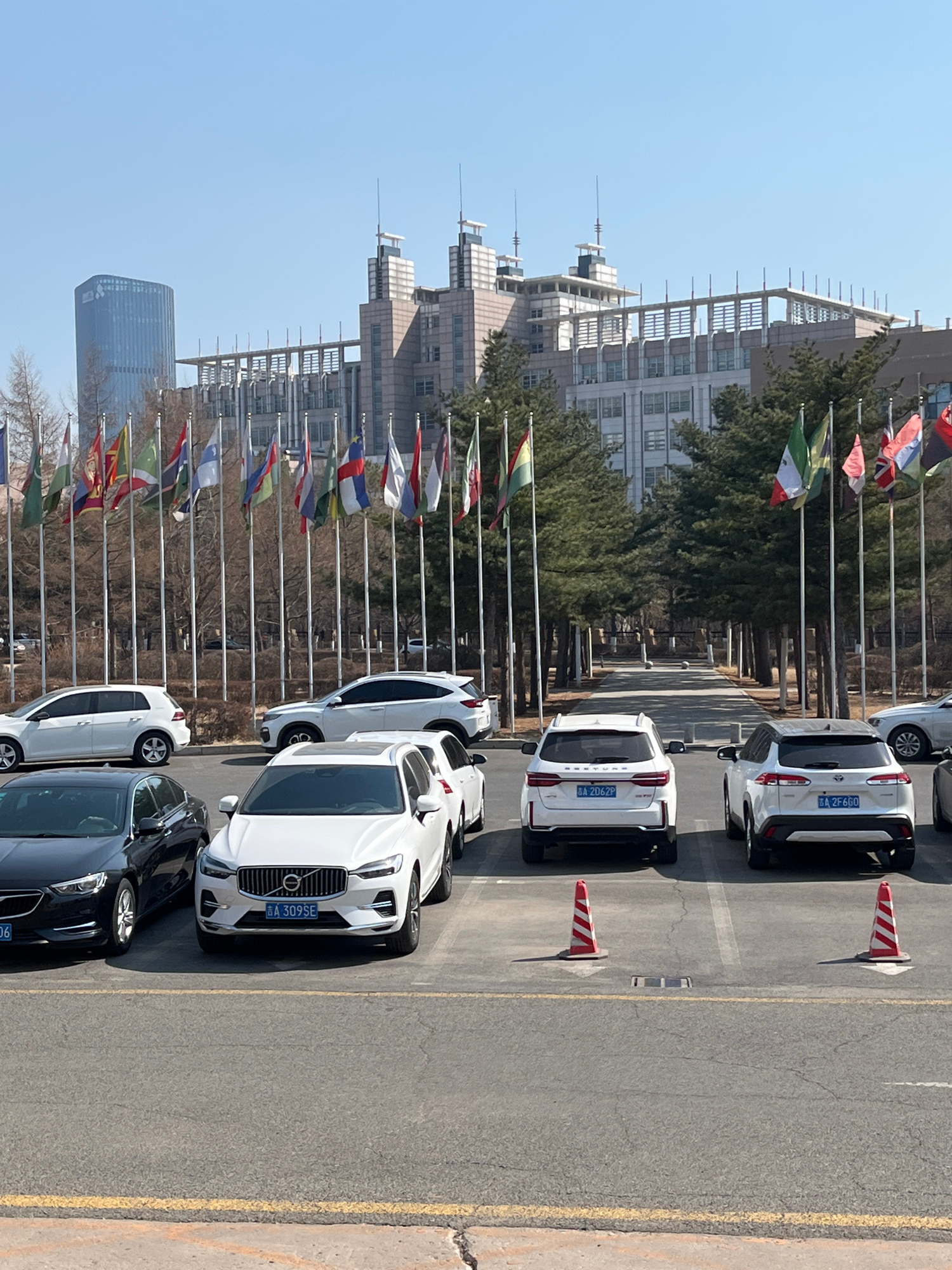 The image shows a street in Changchun City, China lined with international flags. On the right side of the image, cars are parked, interspersed with traffic cones. Buildings can be seen in the backgro…read more