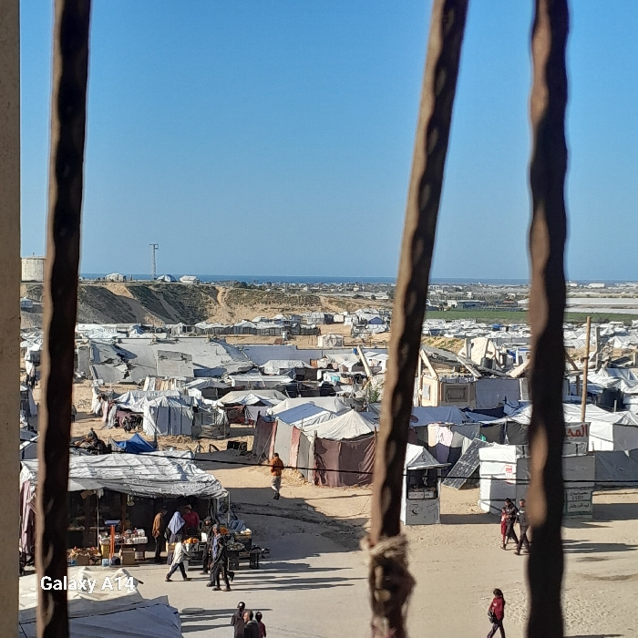 An elevated perspective peers through weathered metal bars, revealing a densely populated settlement along a coastline. Makeshift shelters and tents dominate the landscape, stretching towards the hori…read more