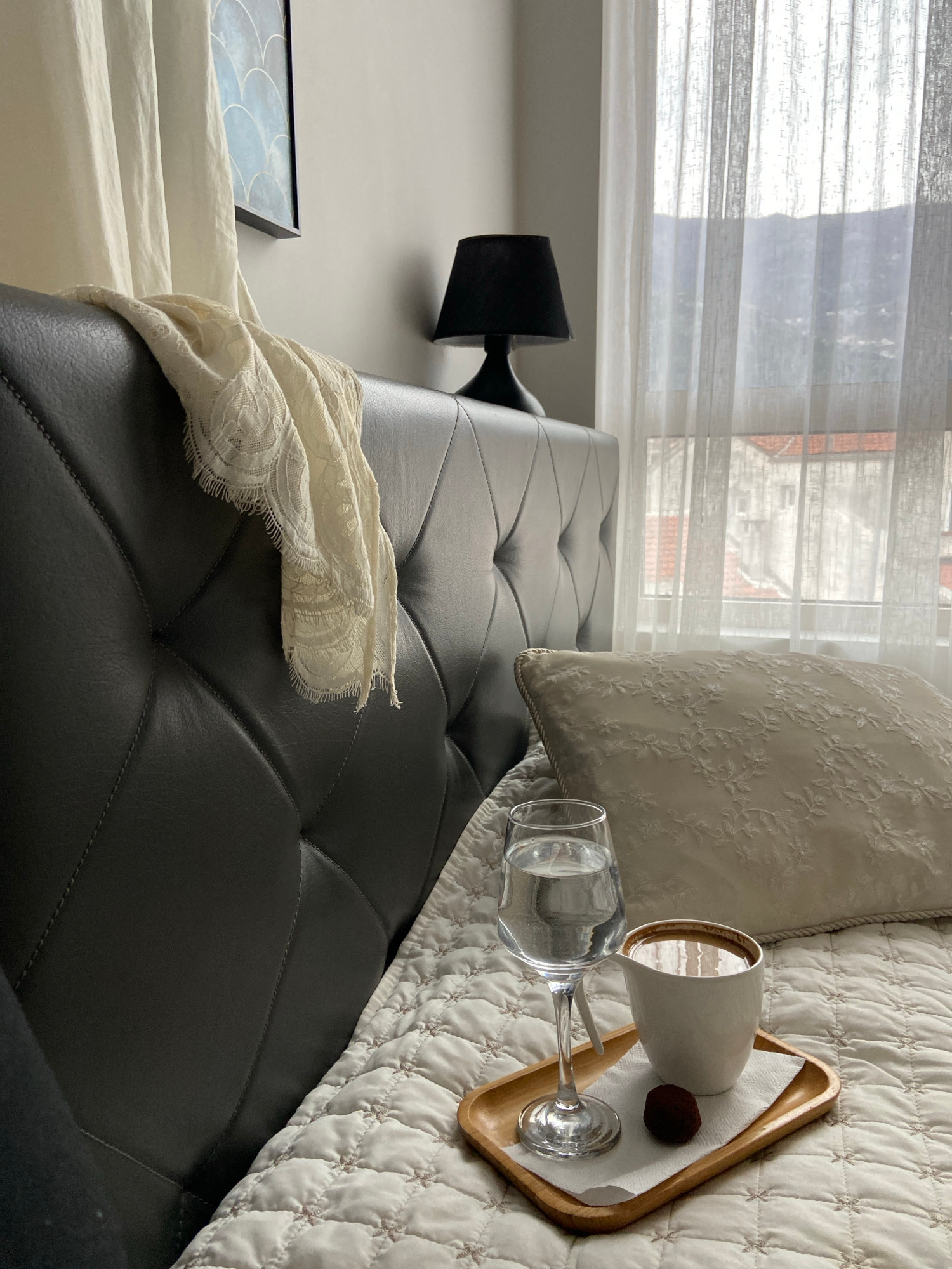 The image shows a room setting with a focus on domestic items. A black tufted sofa or ottoman is prominently featured. On the right side of the sofa is a white quilted blanket and a decorative pillow.…read more