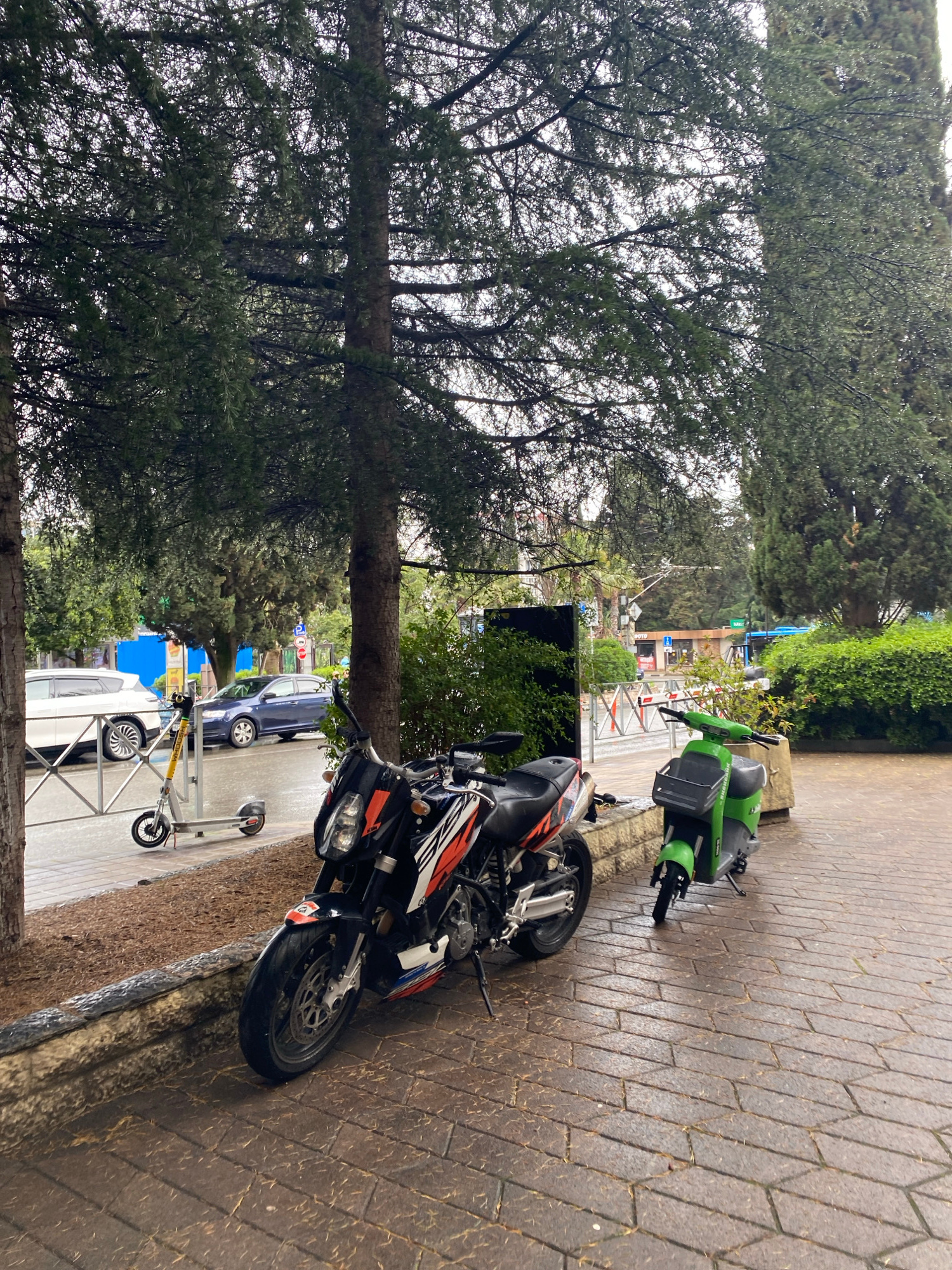 The photograph depicts a street scene in Sochi, Russia. The foreground is dominated by a black and orange motorcycle parked on a brick sidewalk. A green scooter is parked further down the sidewalk. In…read more