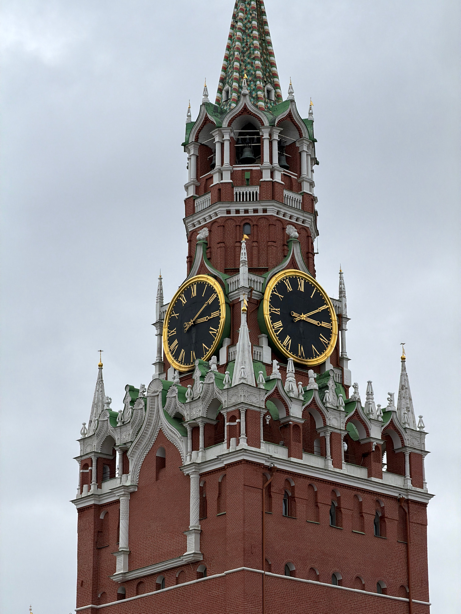 The image shows the Spasskaya Tower of the Moscow Kremlin in Moscow, Russia. The tower is made of red bricks with white and green architectural details. It features two large clocks with gold rims andβ¦read more