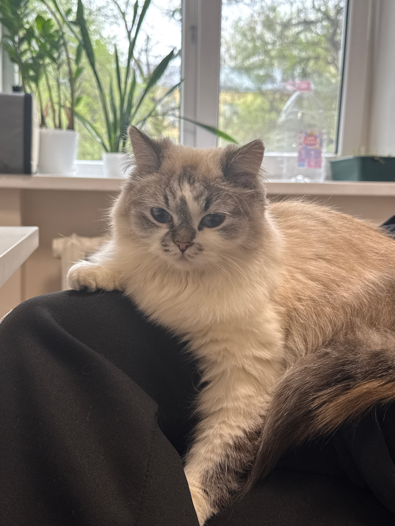 A fluffy domestic cat with prominent blue eyes and cream and grey point coloration is the central subject of this close-up photograph. The image is oriented such that the cat appears to be lying on it…read more