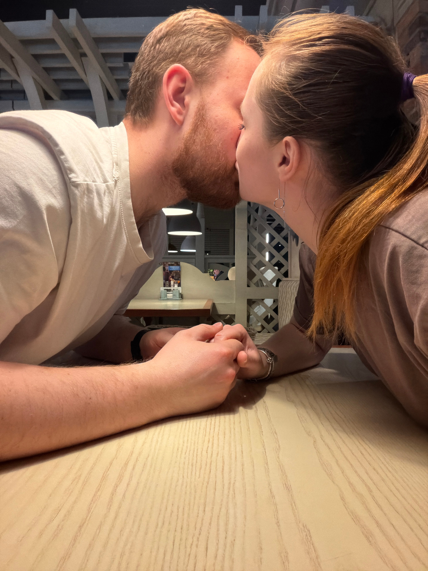 A couple is captured in a close-up shot. The woman, positioned above, has light brown hair with reddish-blonde highlights pulled back in a ponytail. She wears a light brown t-shirt and a silver earrin…read more