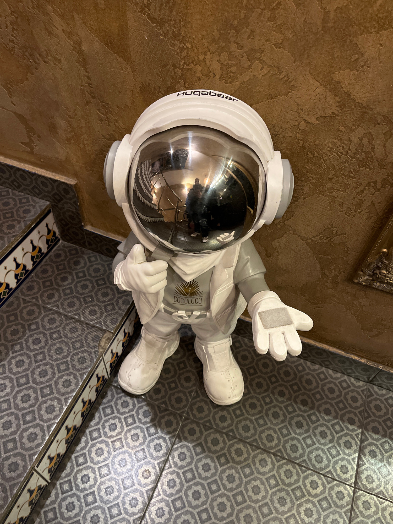 A top-down shot shows a model of an astronaut figurine wearing a white space suit with a large spherical helmet. The helmet reflects the surroundings. "Hugabear" is printed on the side of the helmet.…read more