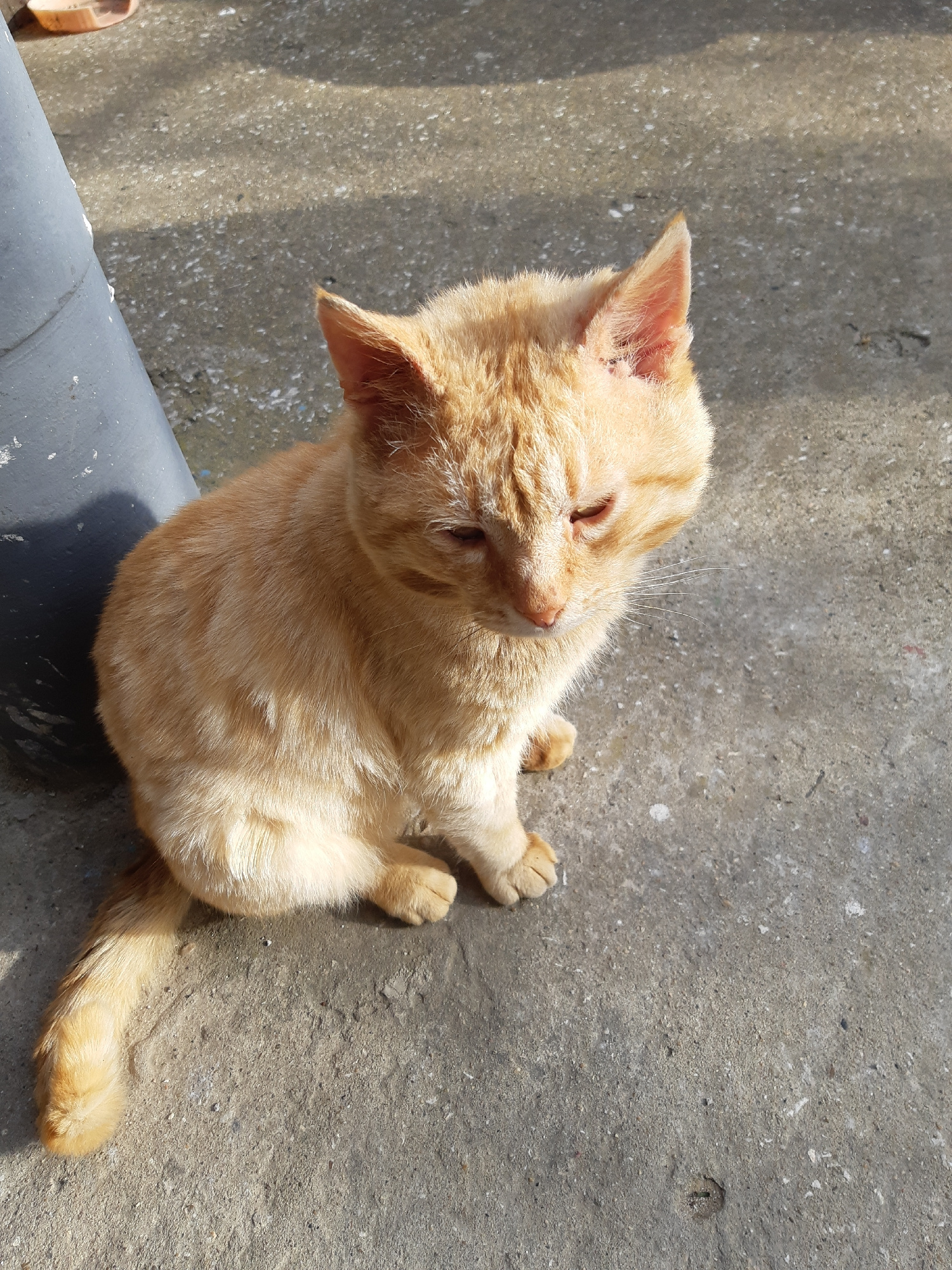 An orange tabby cat is sitting on a gray concrete surface. A dark gray pipe is positioned adjacent to the cat. The location is Хаджийско, Bulgaria.