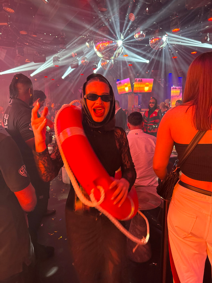 A woman wearing sunglasses and a black hoodie holds a red lifeguard ring in a crowded, dimly lit indoor setting with disco balls and laser lights. She is looking at the camera and appears to be talkinβ¦read more